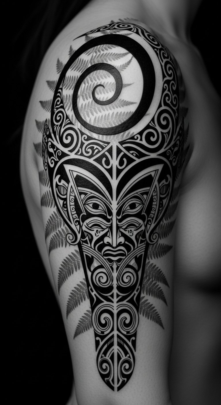 The design balances reverence and personal narrative: koru spirals symbolize new life and growth, manaia elements provide guardianship, and facial moko lines trace lineage and rank; negative-space tapu motifs hint at protected aspects of identity.