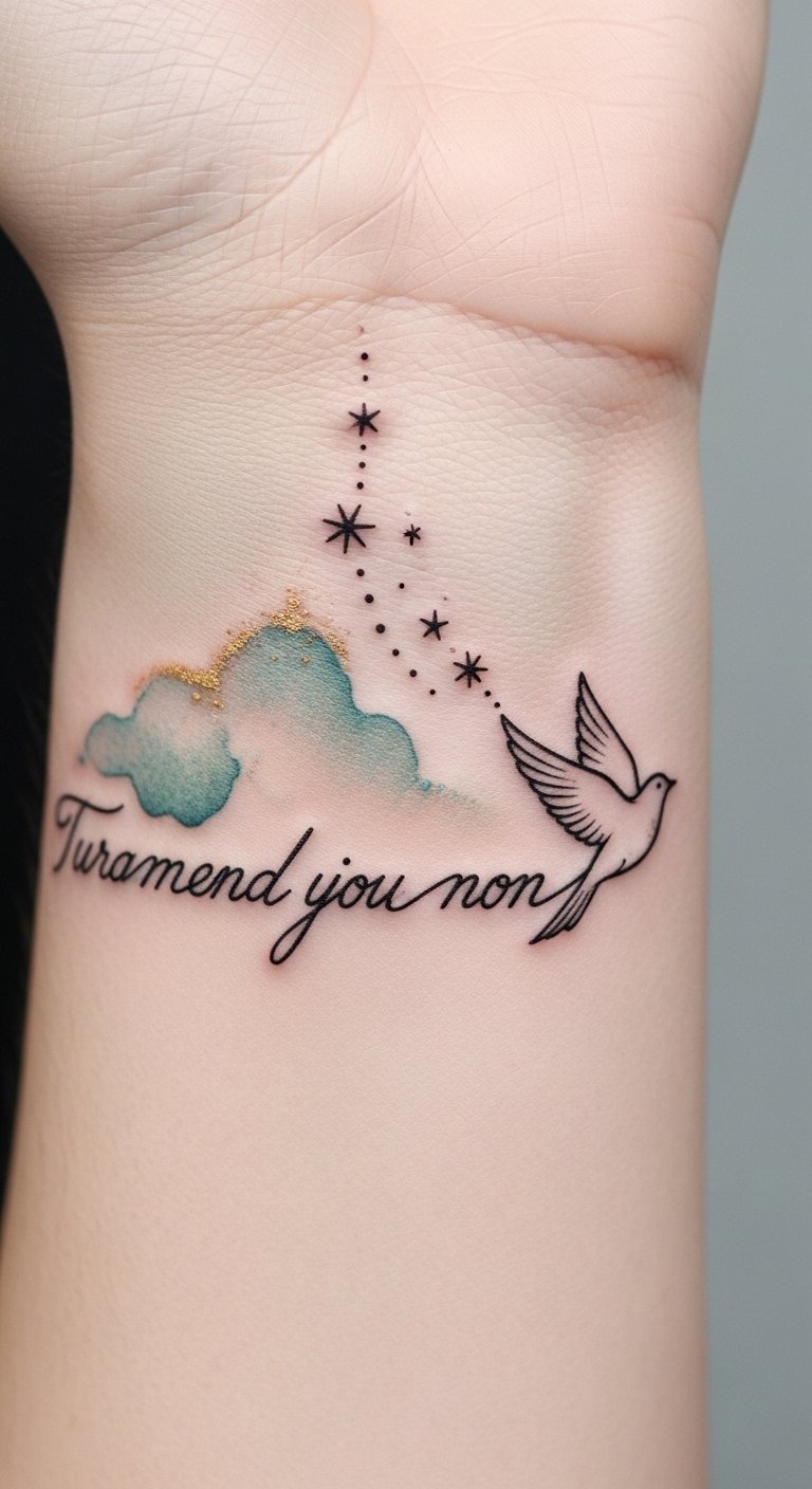 This design pairs the intact quote with a small bird and star elements to symbolize liberation, hope, and the ongoing journey toward self-discovery; the inner wrist placement keeps the message intimate and easily visible for personal affirmation, while the watercolor accent adds warmth and emotion without overpowering the fine-line text, creating a balance between strength and softness.