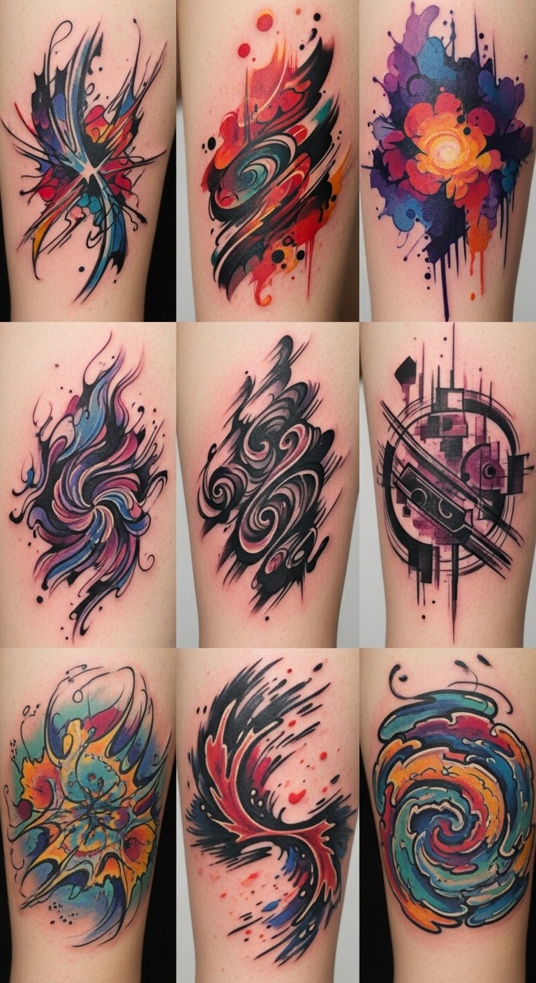 This design uses layered fluid shapes and asymmetrical composition across the upper arm or shoulder blade, mixing bold watercolor splashes with fine-line geometric fragments to symbolize the balance between chaos and control—emotional turbulence softened by intentional form. Color choices (deep teal, sunset orange, muted magenta) map to introspection, passion, and resilience; textured brushstrokes and faint ink wash suggest movement and personal evolution. Placement on the upper arm, ribcage, or along the collarbone allows the piece to read as both intimate and visible, letting the wearer reveal or conceal the work as a statement of identity.