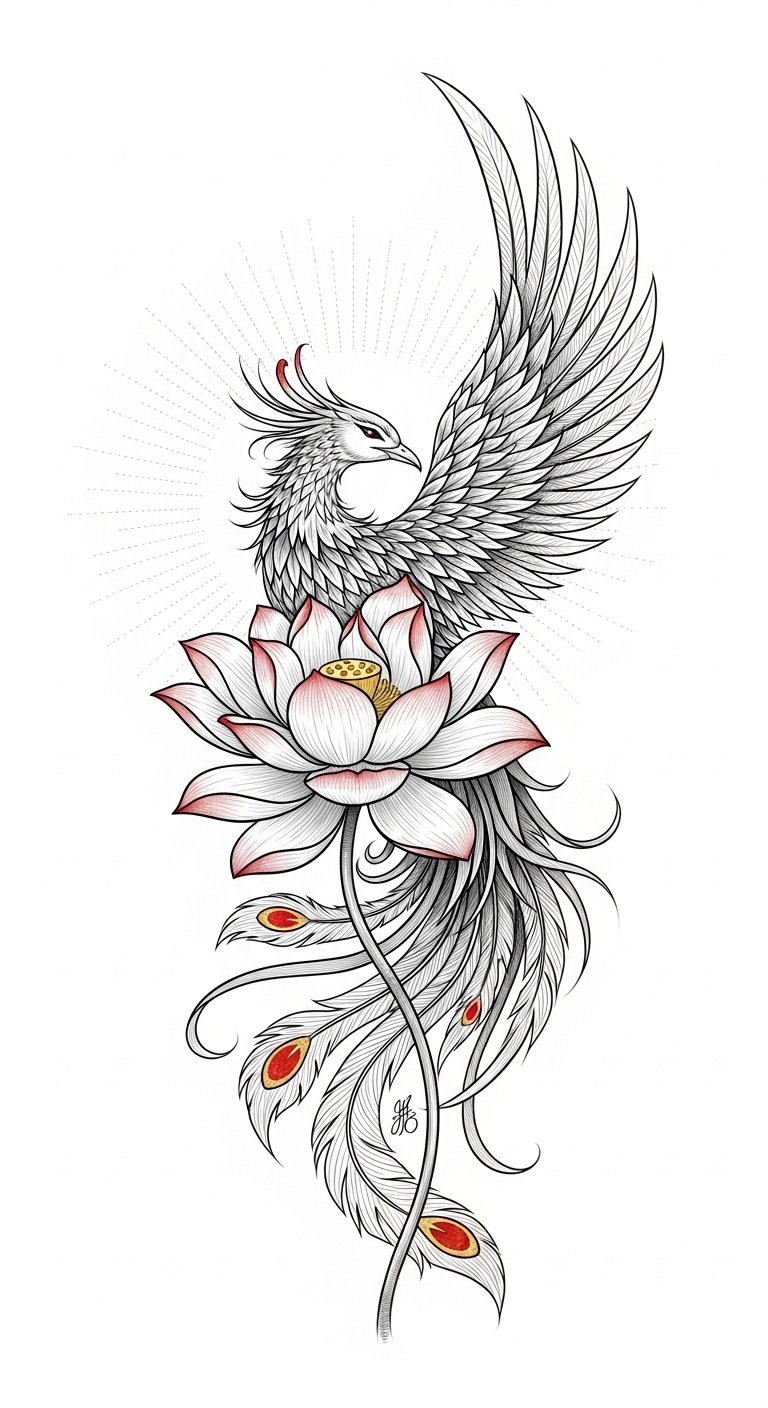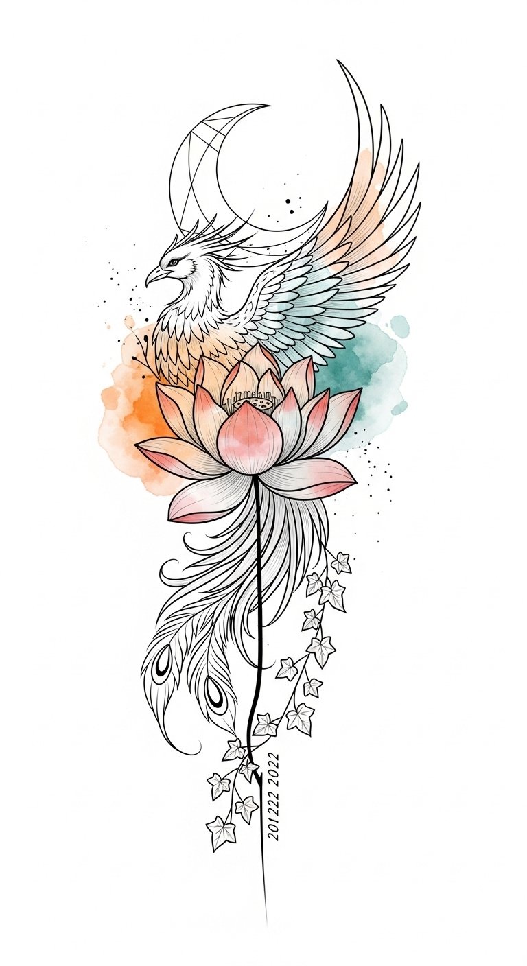 Whether it’s a phoenix rising or a blooming lotus, these designs encapsulate your evolution, empowering you to embrace freedom and the beautiful progress you’ve made. This design combines rebirth (phoenix) and inner awakening (lotus) with a crescent moon for cycles and ivy for steady growth; the muted watercolors evoke tenderness and resilience, while fine lines and small script dates personalize milestones—ideal on the inner forearm or ribcage to keep the meaning intimate or on the shoulder blade for a more visible declaration.