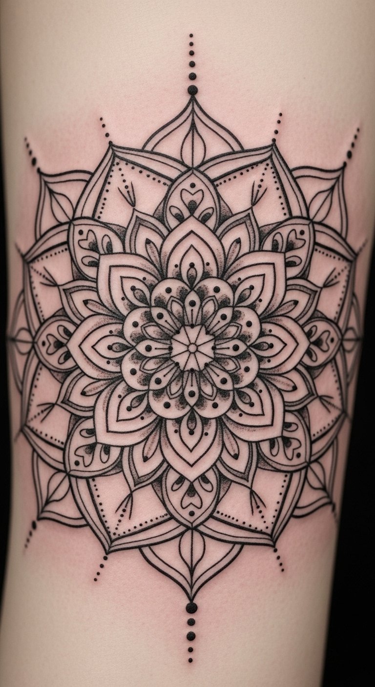 Mandala tattoos evoke inner calm and centeredness through repeated geometric forms and radial symmetry; placing a mandala over the sternum or between the shoulder blades can enhance feelings of protection and emotional alignment, while a smaller wrist or forearm mandala offers a personal talisman for daily mindfulness.