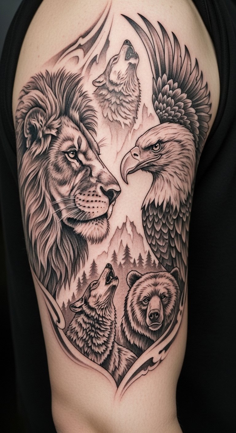 A bold half-sleeve concept combining a roaring lion and a soaring eagle in dynamic contrast: lion’s mane flowing into feathered wings, geometric accents and subtle watercolor splashes in amber and indigo, fine-line details for eyes and talons, negative-space highlights to create movement and depth. Symbolically this piece merges courage and freedom, grounding primal strength with transcendent vision; emotionally it evokes empowerment and inner balance. Ideal placement is the upper arm wrapping toward the chest for visibility and flow, or adapted to the back shoulder blade for a larger, more dramatic canvas.