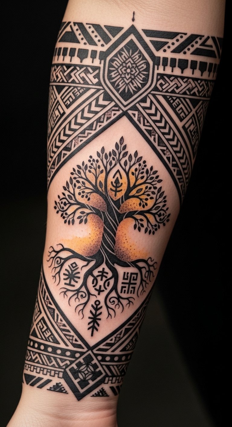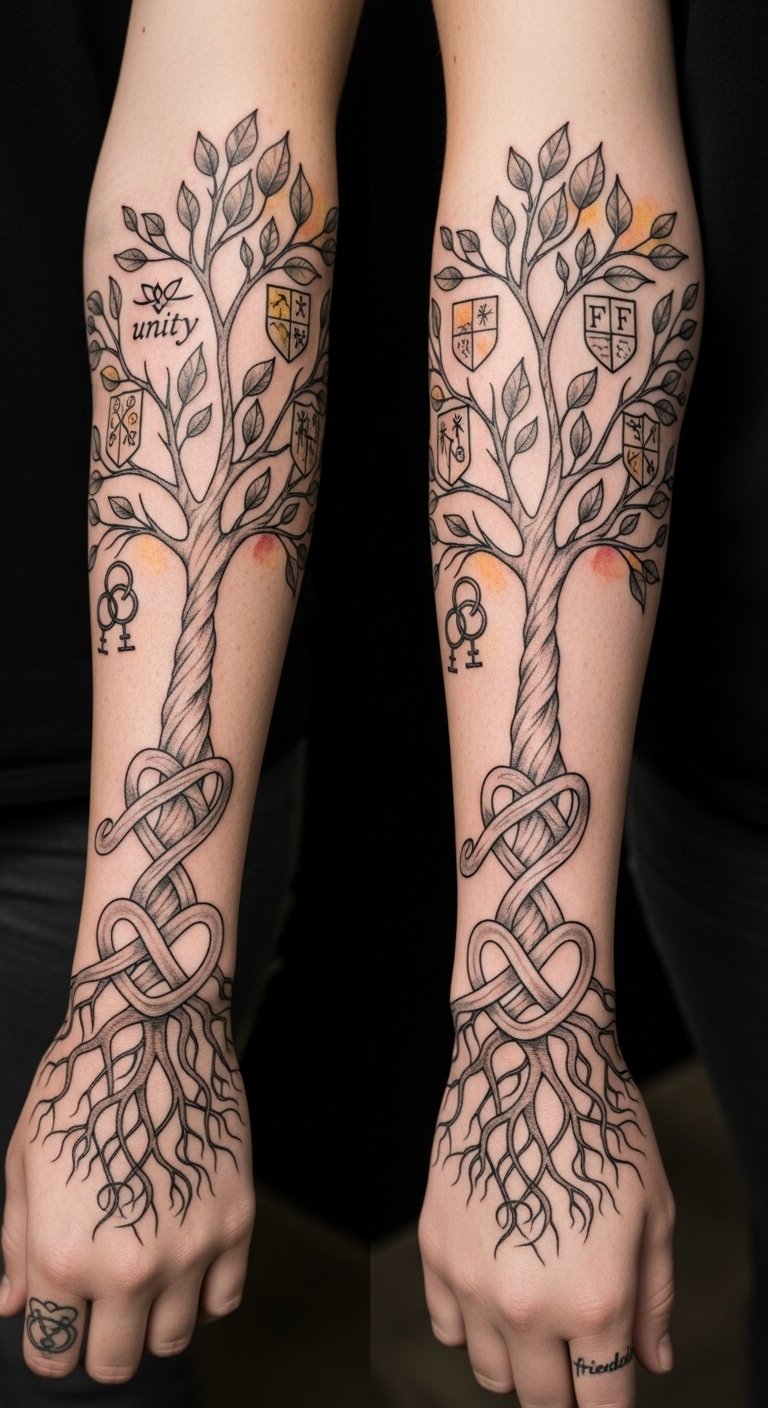 This composition weaves those elements into a single cohesive piece: the family tree represents lineage and grounding, the roots-to-knots transition symbolizes enduring loyalty and unbreakable bonds, crests honor heritage, unity motifs and sibling marks express lifelong commitment, and the small friendship symbol near the wrist offers a personal, visible nod to chosen family;