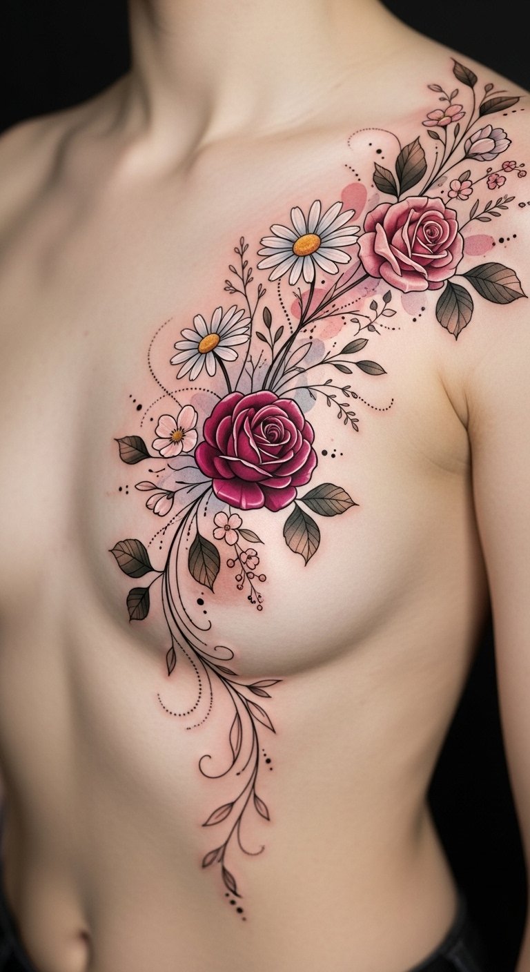 From delicate daisies to bold roses, these designs inspire freedom and self-expression, reminding you that your journey is as unique and colorful as nature itself. The concept evokes renewal and inner strength through contrasting blooms—soft daisies for innocence and roses for passion—creating a balance of vulnerability and power; emotionally it’s calming yet empowering, ideal for placement along the shoulder to collarbone sweep or descending the ribcage where the natural curves emphasize movement and allow the trailing tendrils to flow with the body’s contours, visible or easily covered depending on personal expression.