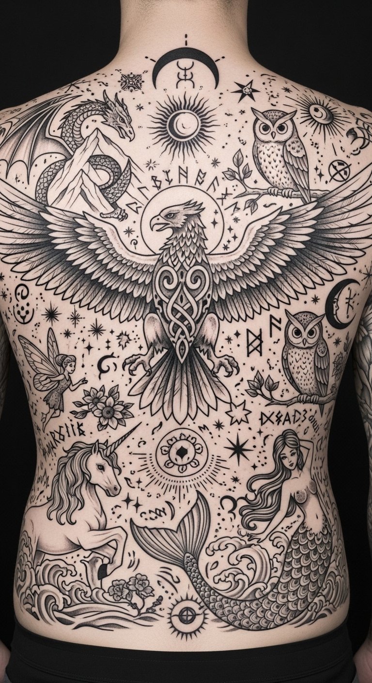 Building on the idea of personal milestones, consider how mythical creatures can add an enchanting layer to your tattoo narrative. Imagine whimsical ink showcasing legendary beasts or magical creatures, each steeped in mythical symbolism. With fantasy tattoos inspired by folklore, these creature designs become mystical representations of your journey. Let mythological motifs breathe life into your skin, transforming your story into mesmerizing art that inspires freedom. The design pairs a central mythical creature—phoenix, dragon, or stag—with smaller folklore elements (runes, crescent moon, flora) winding along the limb or shoulder blade to mark key life events; colors and linework convey resilience and wonder, evoking renewal, courage, and liberation; ideal placements are forearm, calf, or across the ribs where the narrative can flow and be revealed with movement.