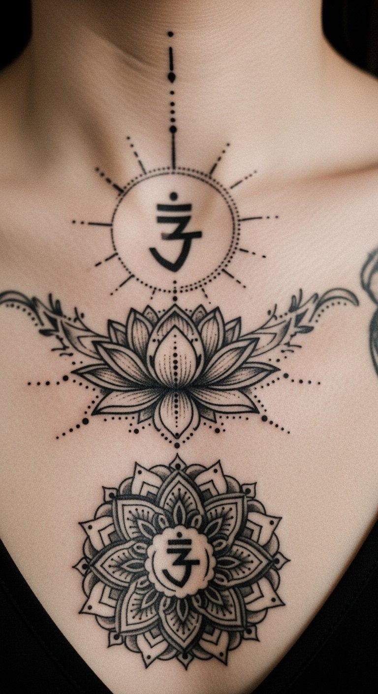 This piece evokes calm, transformation, and devotion—ideal along the sternum for a private, heart-centered placement, vertically on the spine for a journey motif, or on the inner forearm for daily visibility and personal affirmation.