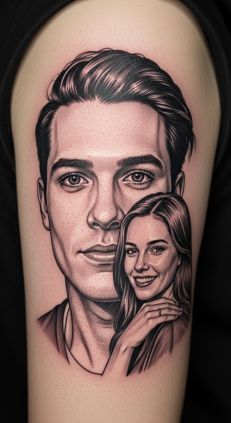 Delicate black-and-gray portrait rendered with fine-line realism, subtle stippling for skin texture, soft contrast to preserve emotional warmth; incorporate faint floral wreath and a small, airy bird silhouette to suggest freedom, with negative-space highlights to enhance eyes and smile; design sized for upper arm or chest, flowing with natural muscle contours so the face reads clearly from multiple angles. The symbolism ties memory (portrait), connection (wreath), and liberation (bird) into a daily, intimate reminder; placed over the heart or bicep it carries emotional weight without overpowering, inviting quiet reflection and personal identity affirmation.
