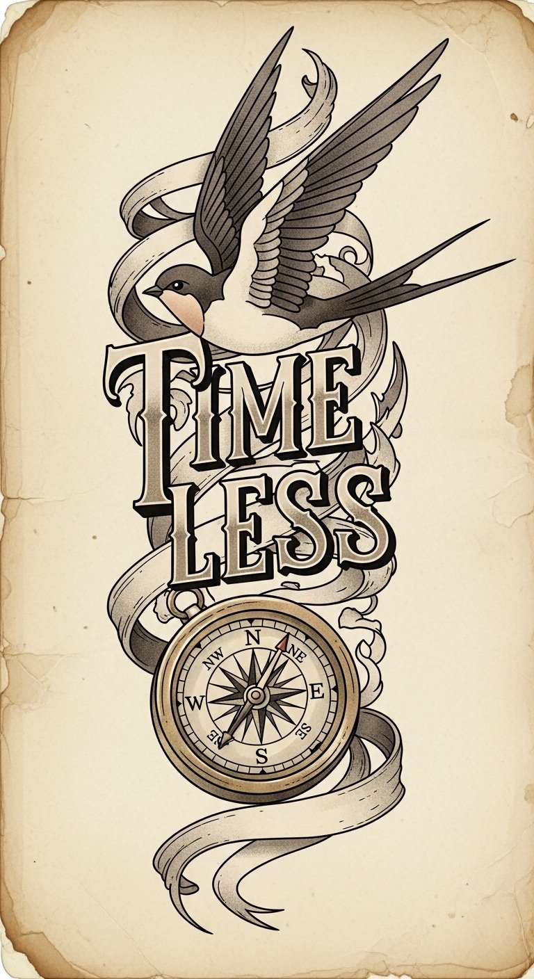 The swallow symbolizes safe journeys and loyalty, the compass represents guidance and personal direction, and the ribbon with the word “Timeless” ties past and present—evoking nostalgia, confidence, and resilience; ideal placed on the upper forearm or chest where it complements natural lines and is visible when you want to share your story.