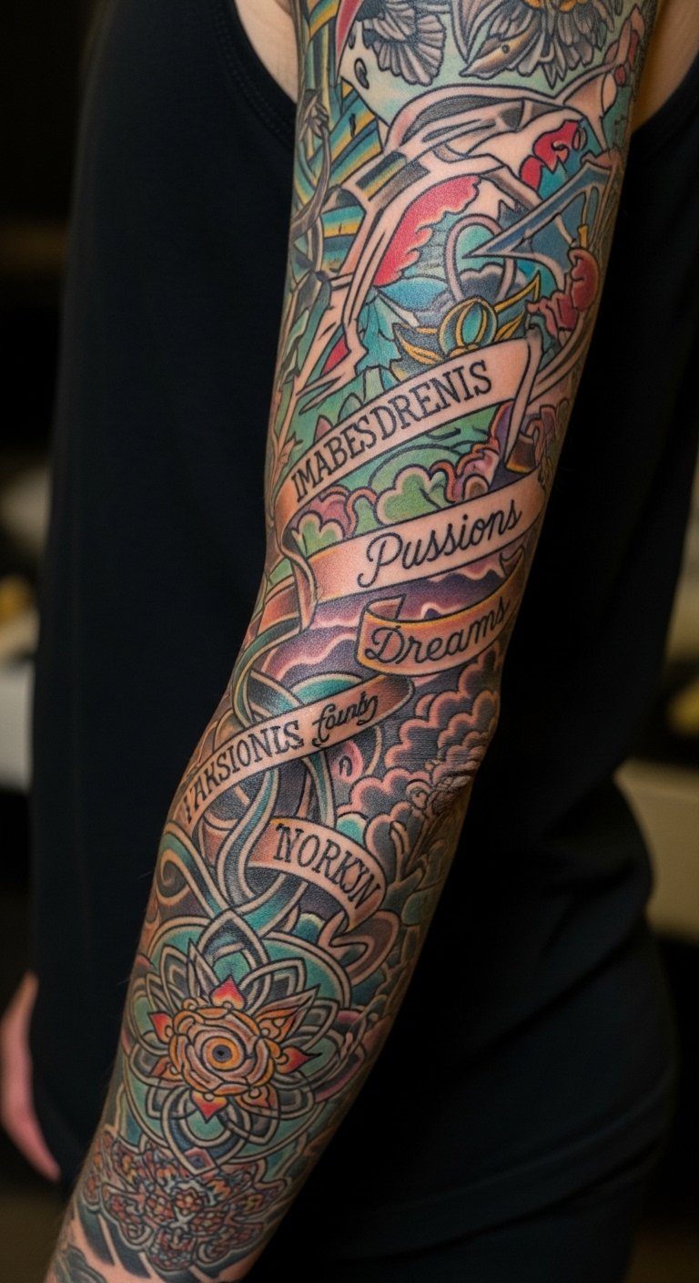 This sleeve concept uses layered imagery—floral motifs, geometric patterns, a soaring bird, and subtle script—flowing from shoulder to wrist to mirror the wearer’s personal journey; flowers represent growth, the bird symbolizes freedom and transitions, geometry ties in structure and balance, and the script holds a private motto. Emotionally it balances bold color with soft shading to convey resilience and vulnerability simultaneously. Place larger elements like the bird and main florals on the outer arm and shoulder for visibility, with smaller geometric connectors and script wrapping the inner arm and wrist for intimacy and continuity.