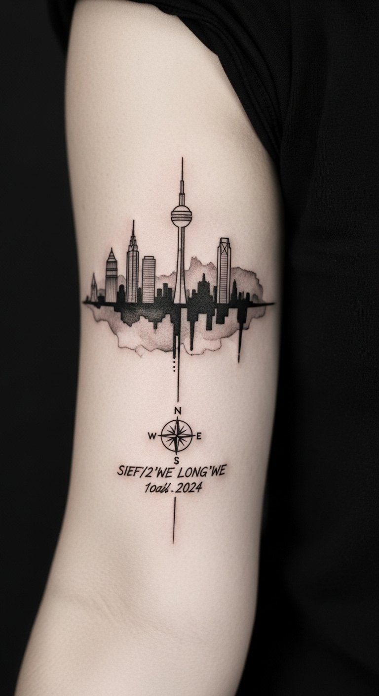 This design concept uses the skyline as an anchor for identity and the coordinates to mark a specific, personal moment — together they symbolize memory, belonging, and forward motion. The watercolor wash evokes emotion and atmosphere without dominating the composition, while the compass and date add layers of meaning (direction and time). Ideal placements like the inner forearm or collarbone allow the piece to be both intimate and visible, facilitating personal reflection or sharing; over the ribs offers a more private, contemplative option.