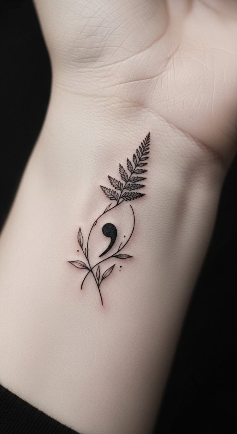 Embrace the secret art, and let it empower you in your everyday life. The semicolon symbolizes continuation and survival, paired with the fern frond representing growth, renewal, and quiet resilience; placed behind the ear it becomes a private talisman felt more than seen, on the inner wrist it offers a subtle daily reminder.