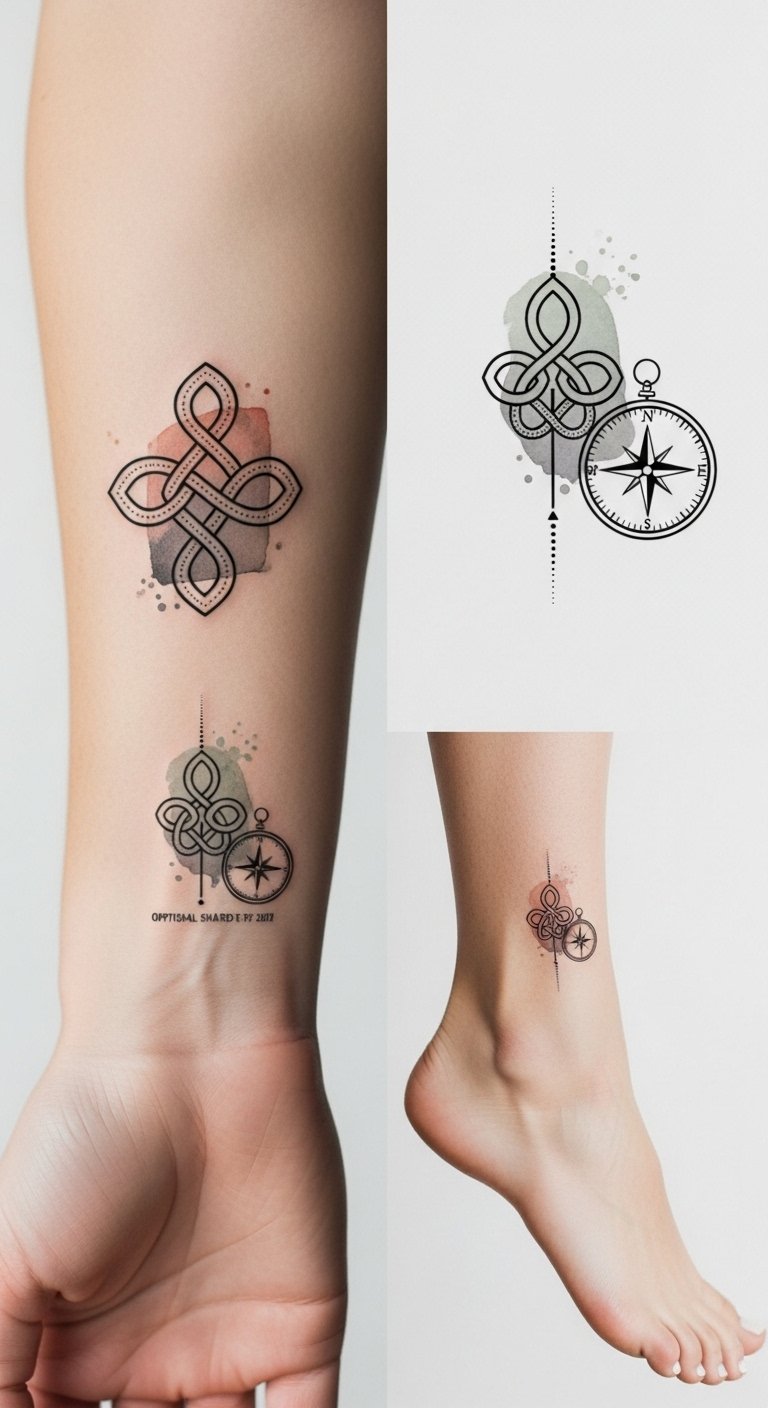 A delicate, modular tattoo concept inspired by the original text: a series of small, interchangeable motifs—an open hand, a winding path, a tiny compass rose, and a fluid brushstroke—rendered in fine black lines with subtle watercolor accents in muted teal and warm ochre; motifs can be combined or placed separately along the forearm, upper back, or behind the ear to test scale and arrangement. Symbolically, the hand represents choice and touch, the path echoes personal journey, the compass suggests direction, and the brushstroke embodies creative expression; emotionally it supports experimentation, empowerment, and relief from permanence anxiety, while placement options allow discreet or visible trials to see what best aligns with identity.