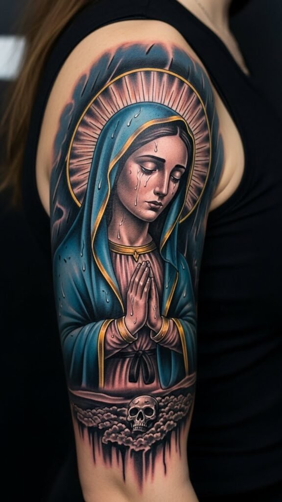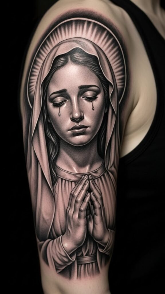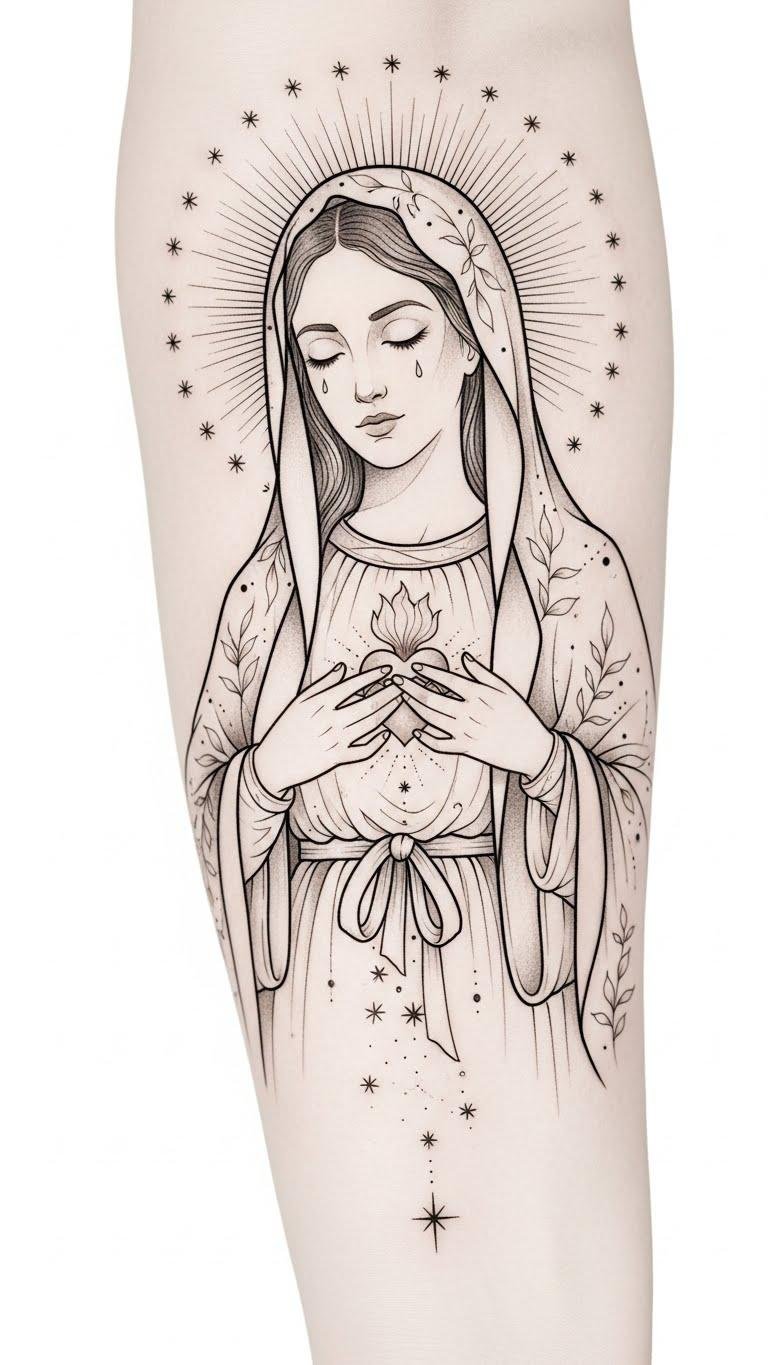 With artistic techniques that bring lifelike details to life, your tattoo becomes a moving tribute to faith, evoking a profound connection to the divine. The design symbolizes compassion, protection, and sacred sorrow—her tear and clasped hands conveying empathy and intercession; the soft halo and veil suggest sanctity without ostentation.
