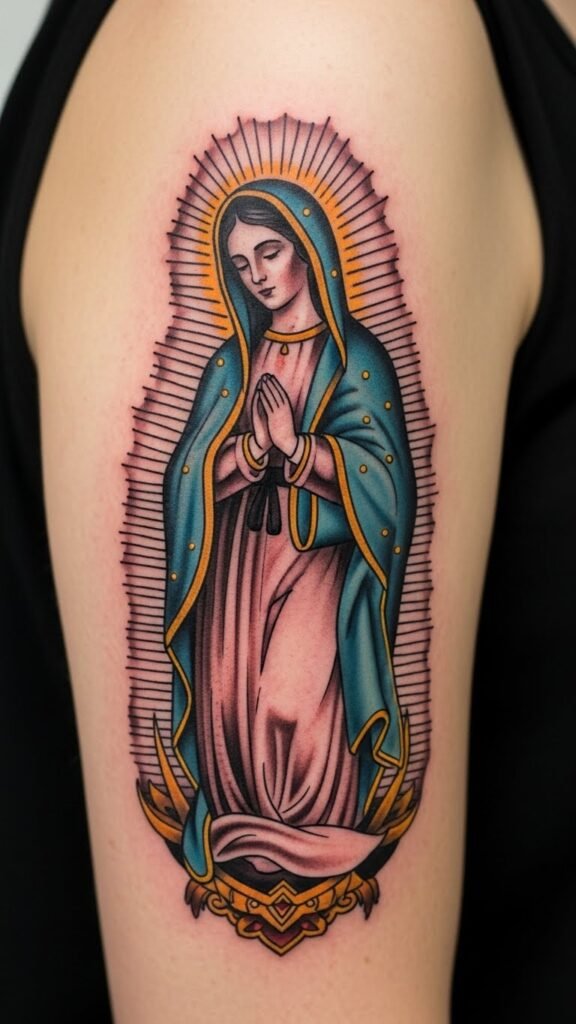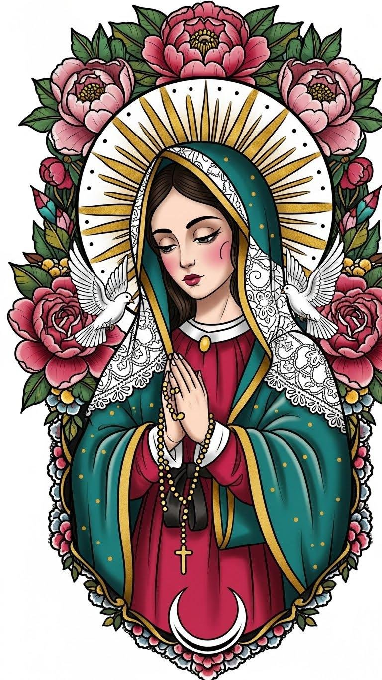 This design pairs the provided neo-traditional description with symbolism of protection and resilience — the Virgin Mary rendered with contemporary vibrancy signals both devotion and personal strength.