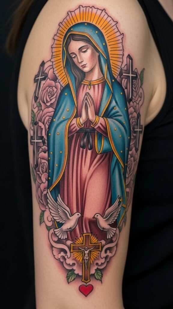 Exploring the integration of Christian symbols with Virgin Mary tattoos amplifies the spiritual significance of these designs, creating a rich tapestry of faith and devotion.