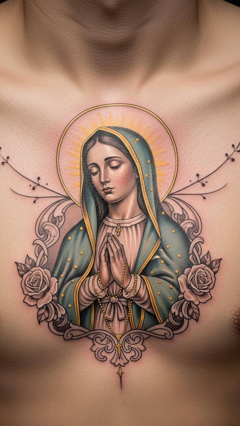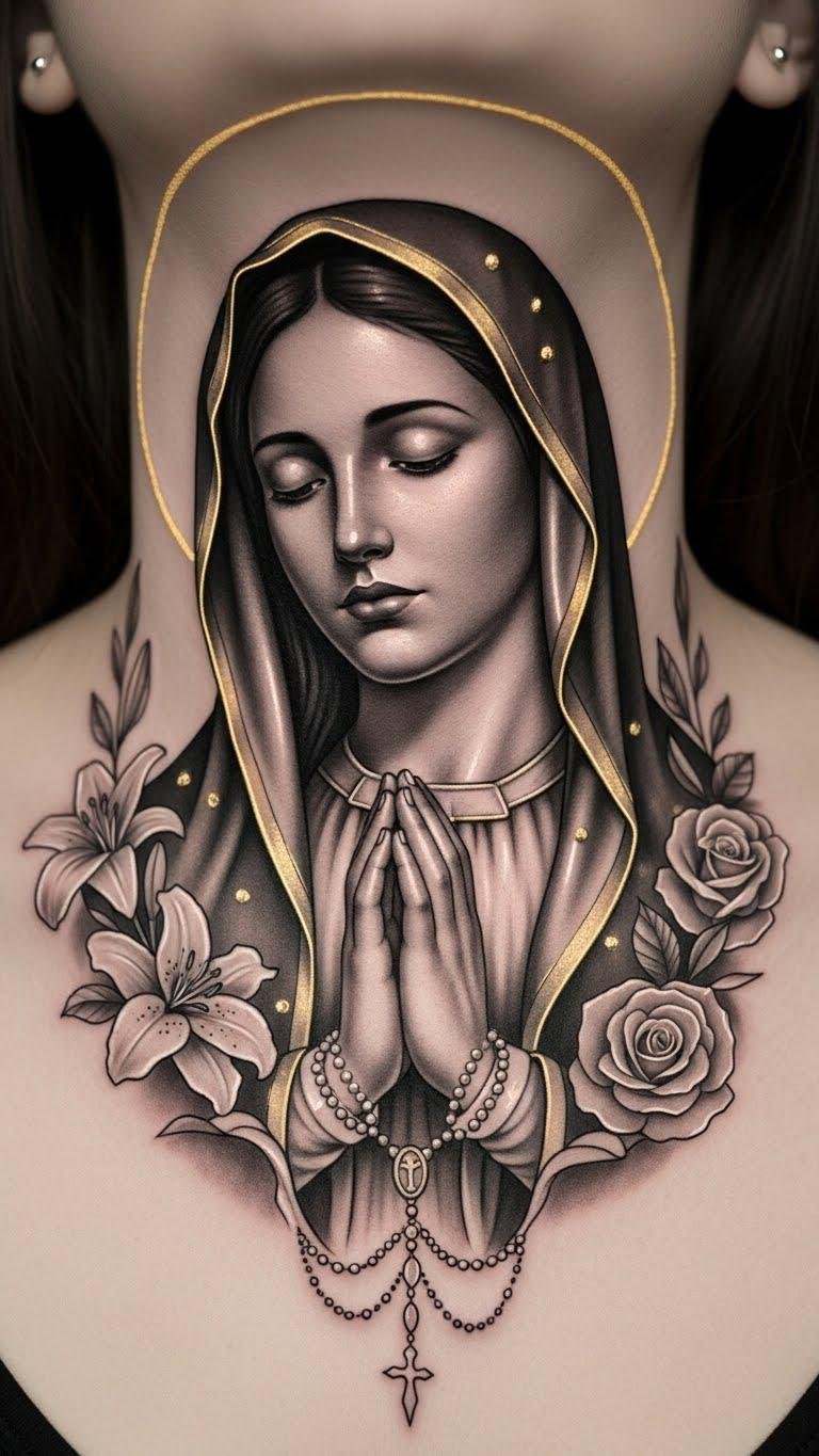 Opt for reverent designs that resonate with your spiritual connection, ensuring that your body art serves as a beautiful faith expression, honoring both your beliefs and the sacredness of the Virgin Mary. This placement centers the image over the throat to symbolize voice and devotion, the halo and clasped hands conveying sanctity and prayer, rosary beads drawing the eye downward to integrate with natural body lines, and the floral accents representing purity and compassion; overall the tone should evoke quiet reverence and personal devotion, mindful of visibility and cultural respect.