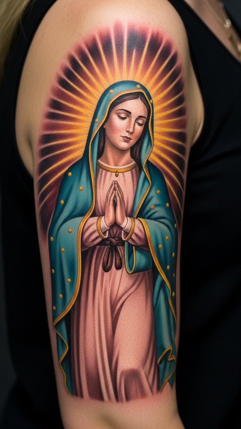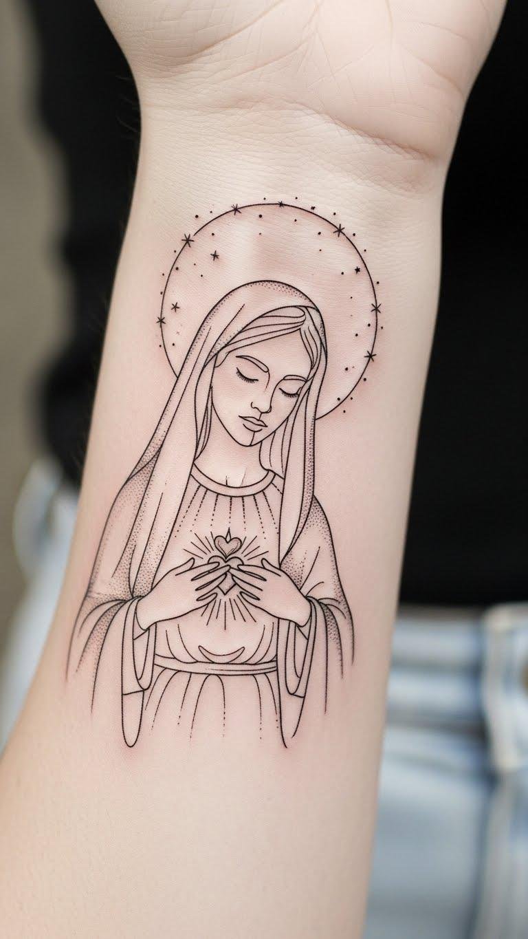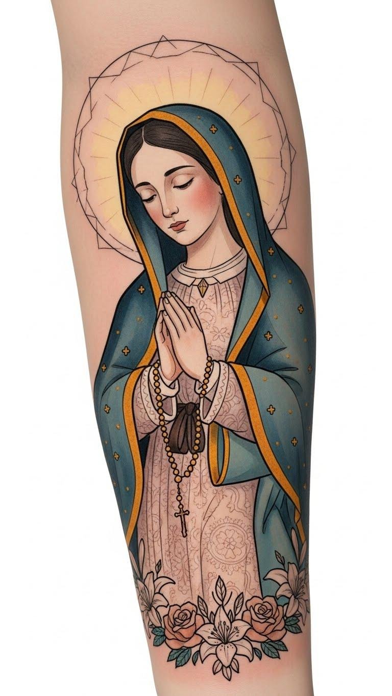 Embracing the sacred femininity of the Virgin Mary, your tattoo might reflect her maternal archetype and divine compassion.