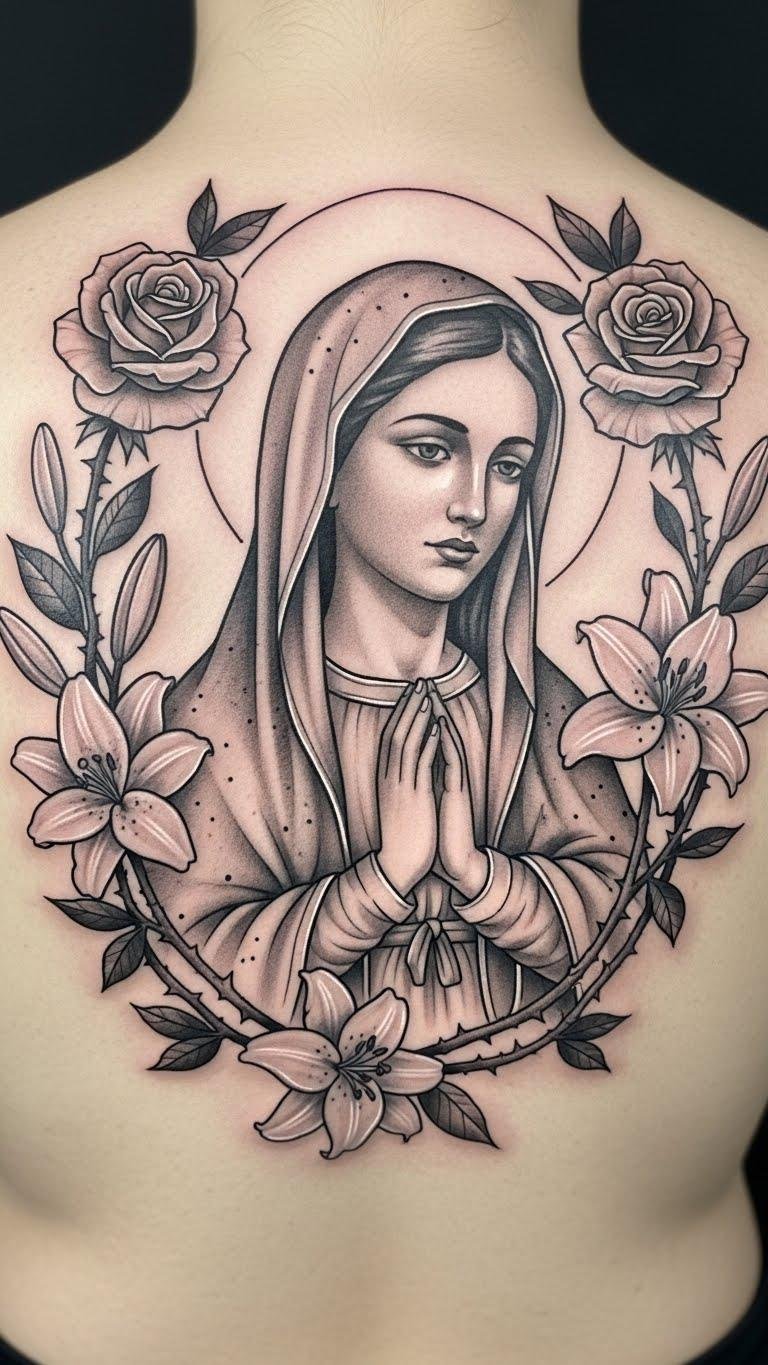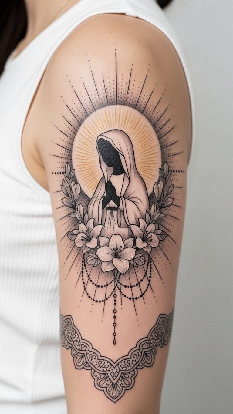 This design aims to honor reverence and introspection: the halo and muted gold accents signify sanctity, roses and lilies represent love and purity, and the rosary hints at devotion without dominant religiosity; dotwork and lace add quiet elegance.
