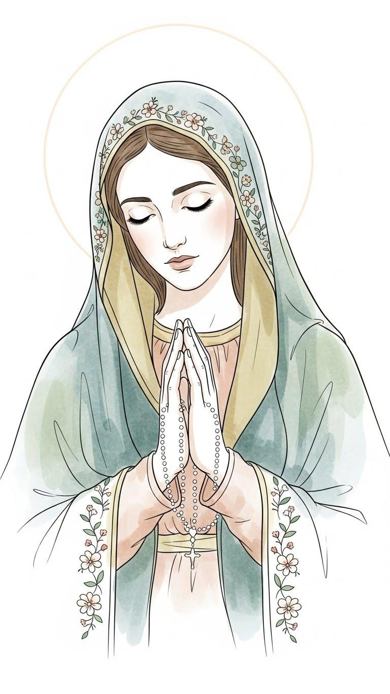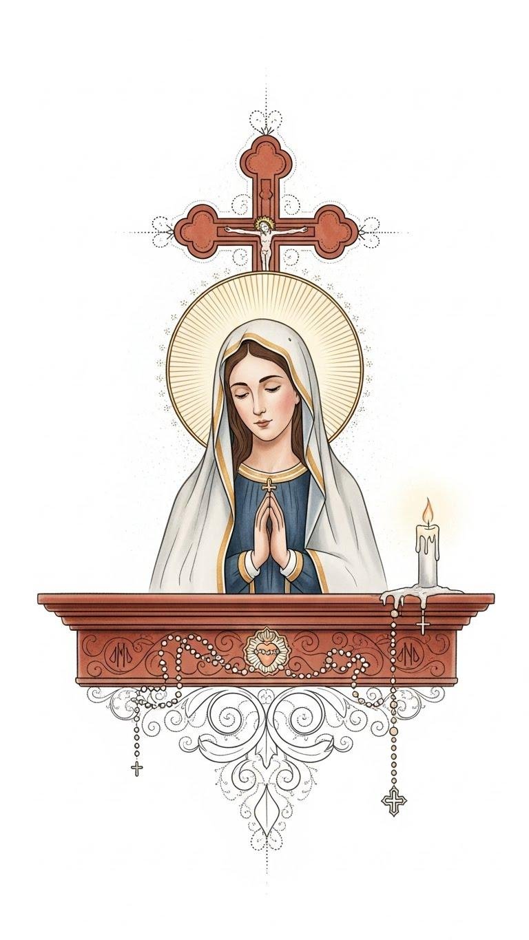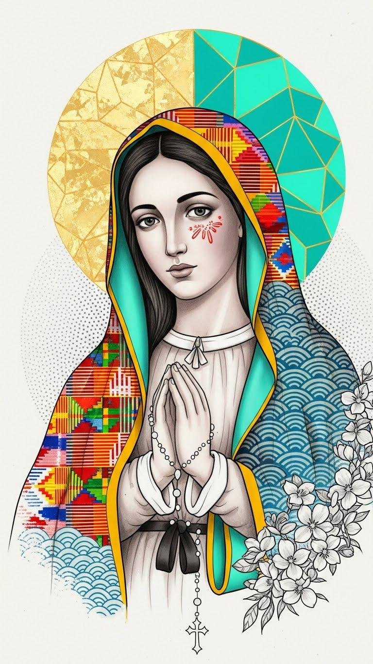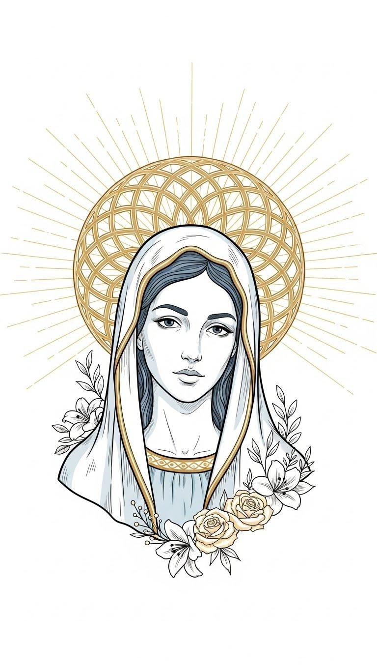 This placement keeps the image close to view and touch, invoking comfort and presence; the halo and geometric rays suggest divine guidance, the rosary and flowers symbolize devotion and purity, and the muted palette with fine-line detail evokes both reverence and contemporary aesthetic.