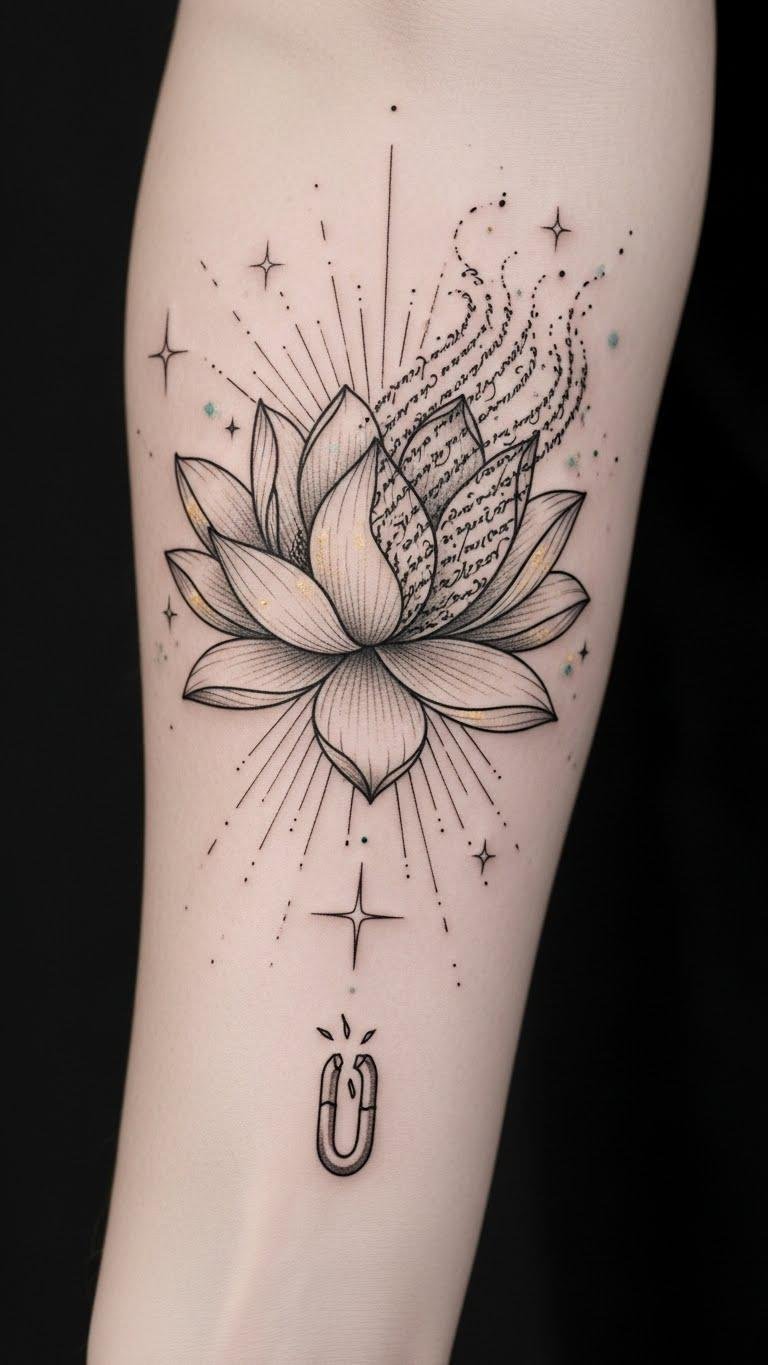 Place on the inner forearm where it can be seen easily for daily affirmation; the lotus and rays convey growth and light, the script-like petals hint at personal words or mantras, stars evoke guidance, and the broken chain symbolizes liberation — together fostering calm, strength, and ongoing spiritual reflection.