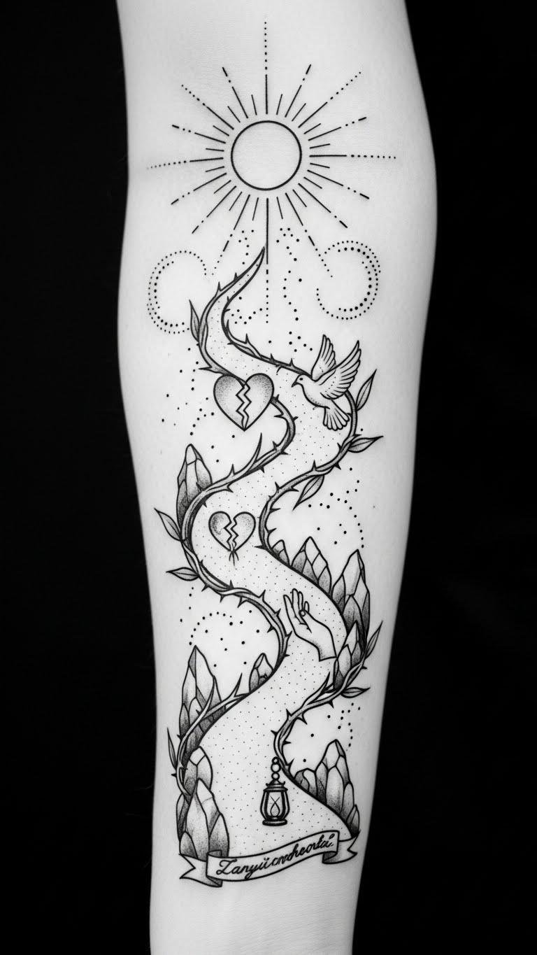 Dotwork and negative space create a contemplative, meditative feel; placed vertically on the inner forearm or along the ribcage it reads as a personal testament—visible during reflection, private in intimate moments—evoking resilience, hope, and quiet transformation.