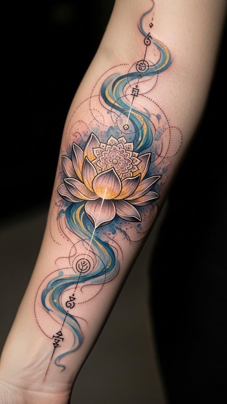 Watercolor tones evoke emotional softness and transcendence, while fine line and dotwork lend intimacy and timelessness. Ideal placement is the inner forearm to allow visibility for self-reflection and concealment when needed; the vertical arrangement follows natural arm lines so the imagery reads coherently in motion, inviting both the wearer and observer into a contemplative experience.