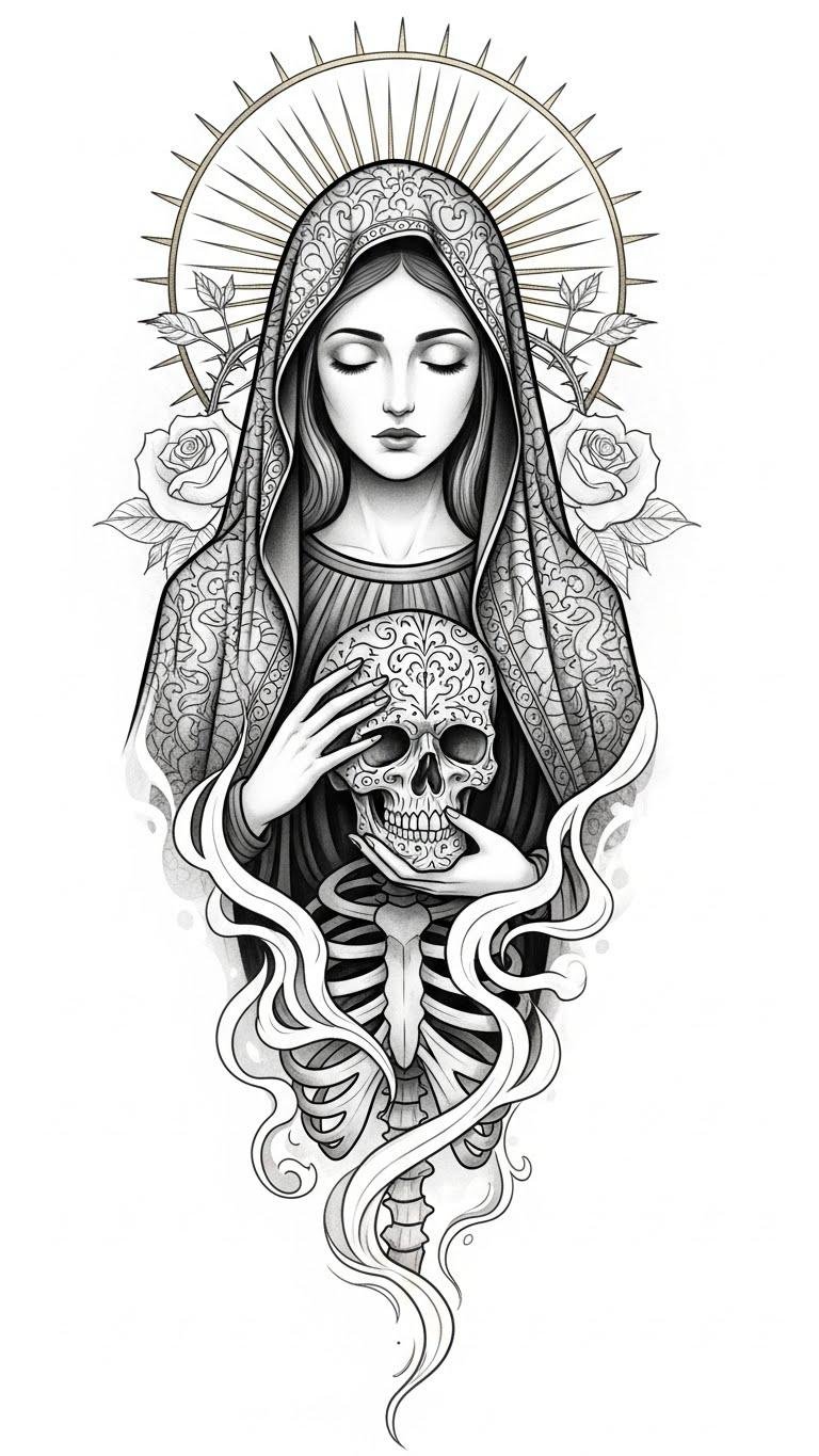 Darker-themed Virgin Mary tattoos invite a contemplative exploration of faith and mortality, seamlessly blending spiritual reverence with somber undertones.
