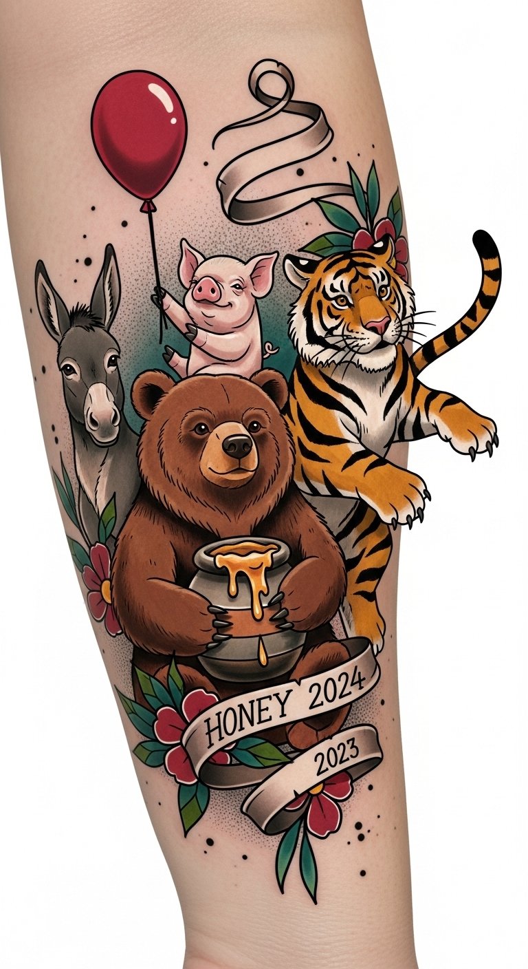 Each tattoo reflects playful innocence, reminding you of simpler times when joy was found in honey pots and adventures in the Hundred Acre Wood.