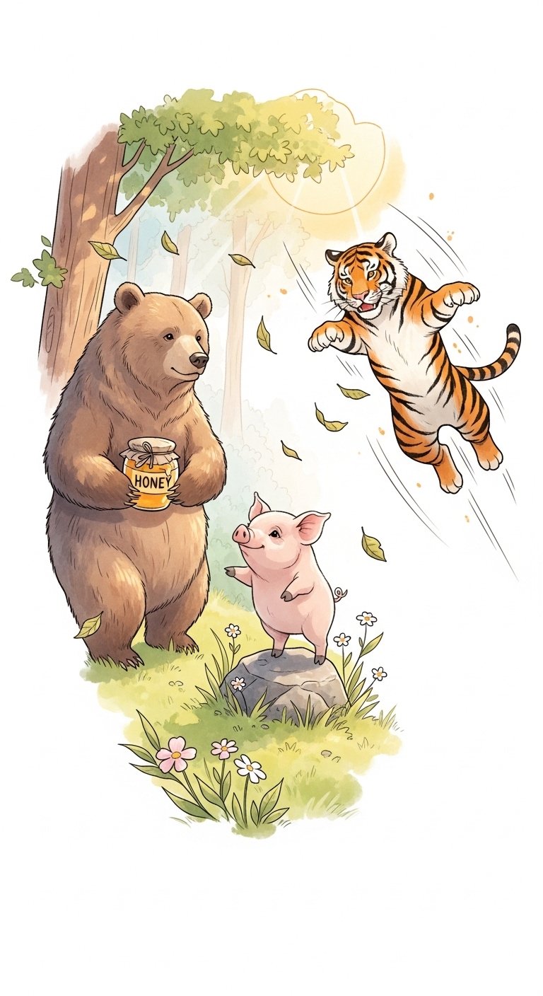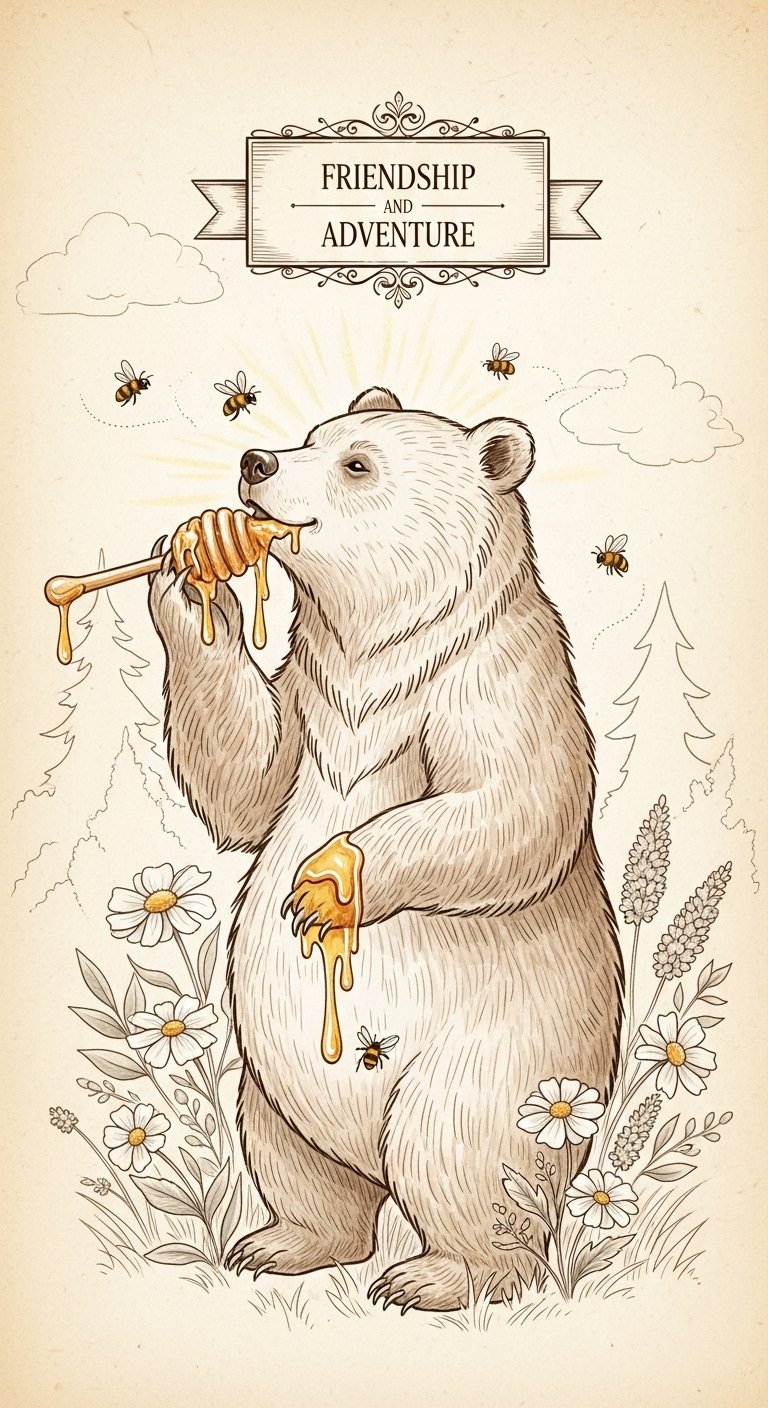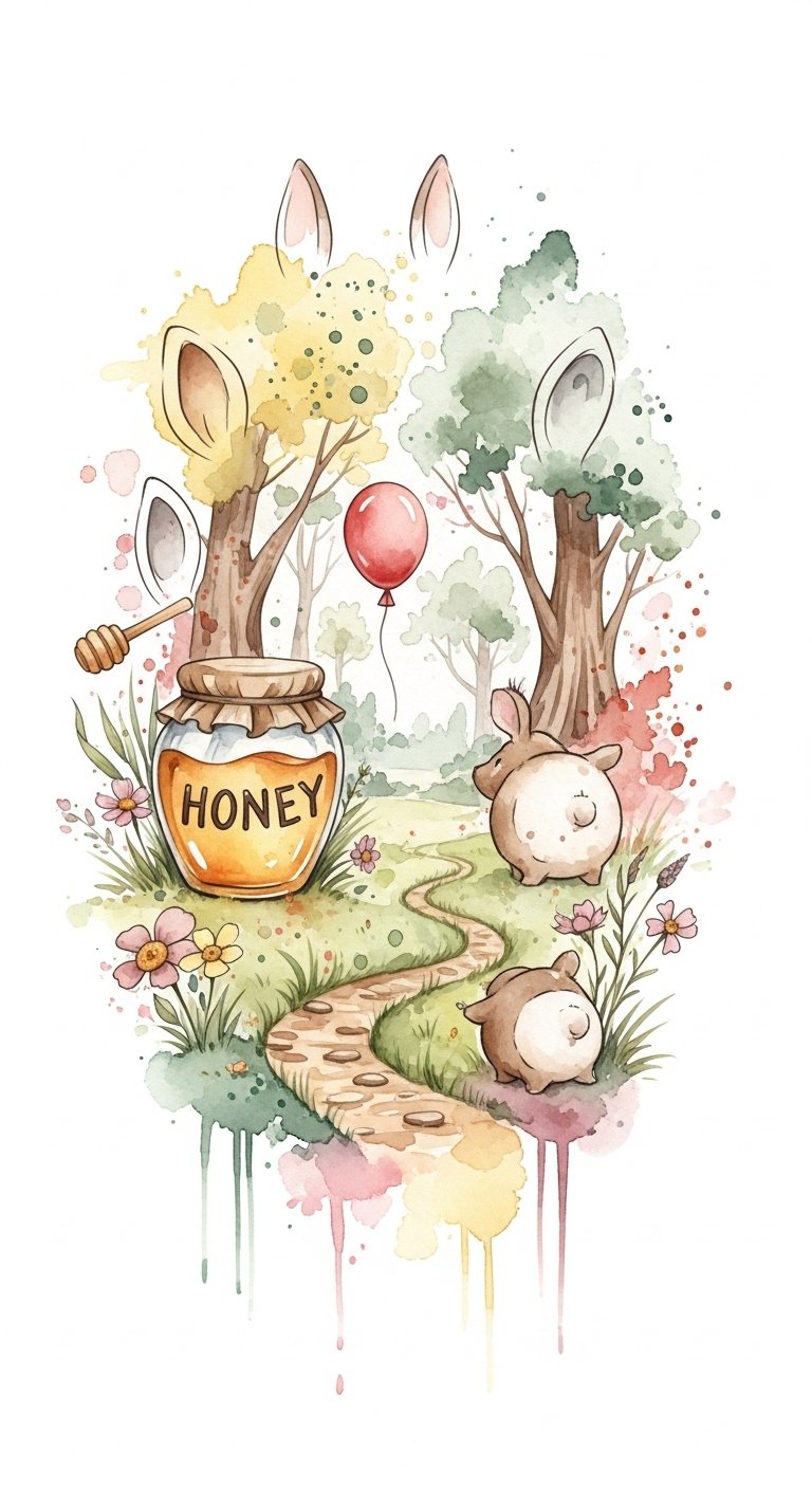 These elements symbolize childhood wonder, friendship, and carefree adventure; the honey jar and balloon evoke sweetness and hope, the winding path suggests life’s gentle journey, and the muted animal silhouettes invite nostalgia without explicit likenesses—together the piece feels tender, whimsical, and quietly joyful.