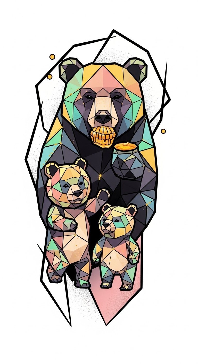 This tattoo concept uses geometric forms to symbolize the simplicity and enduring bond between friends—Pooh’s rounded shapes for warmth and comfort, Piglet’s small angled pieces for courage in vulnerability, and Tigger’s dynamic lines for energy and joy.