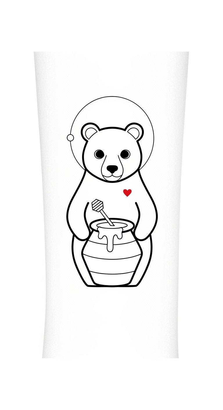 This concept symbolizes warmth, nostalgia, and gentle joy through restrained forms—the thin circle halo and small red heart add quiet tenderness while the geometric honey pot nods to playful appetite; emotion is calm and affectionate.