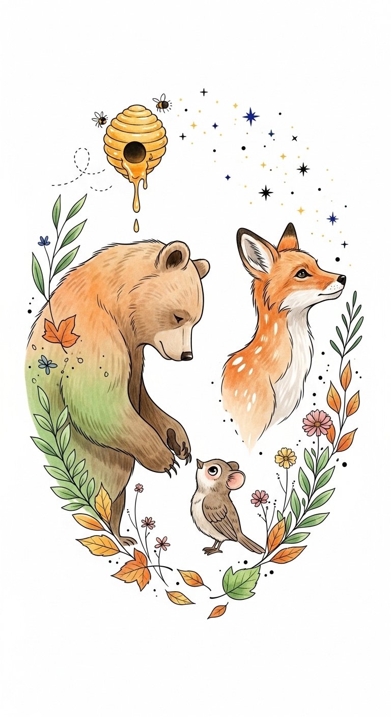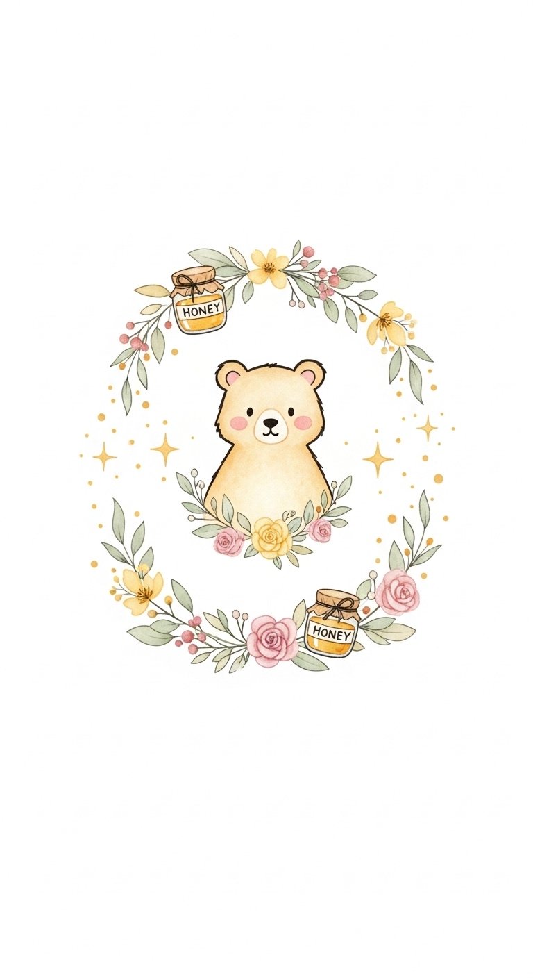 This design uses gentle watercolor tones and soft linework to evoke warmth and nostalgia; Pooh and Piglet symbolize comfort and courageous smallness, the honeycomb lanterns represent sweet memories and guiding light, and the airy background suggests openness to wonder.
