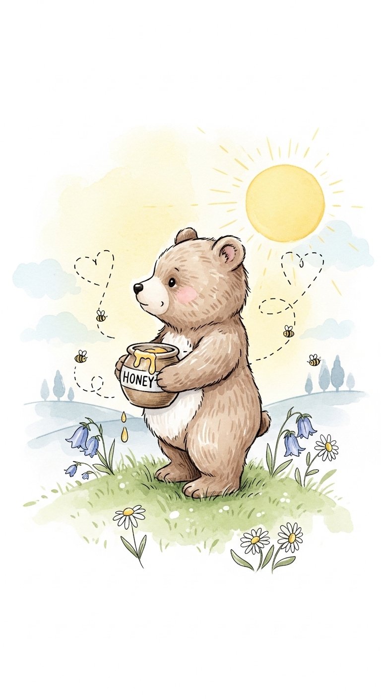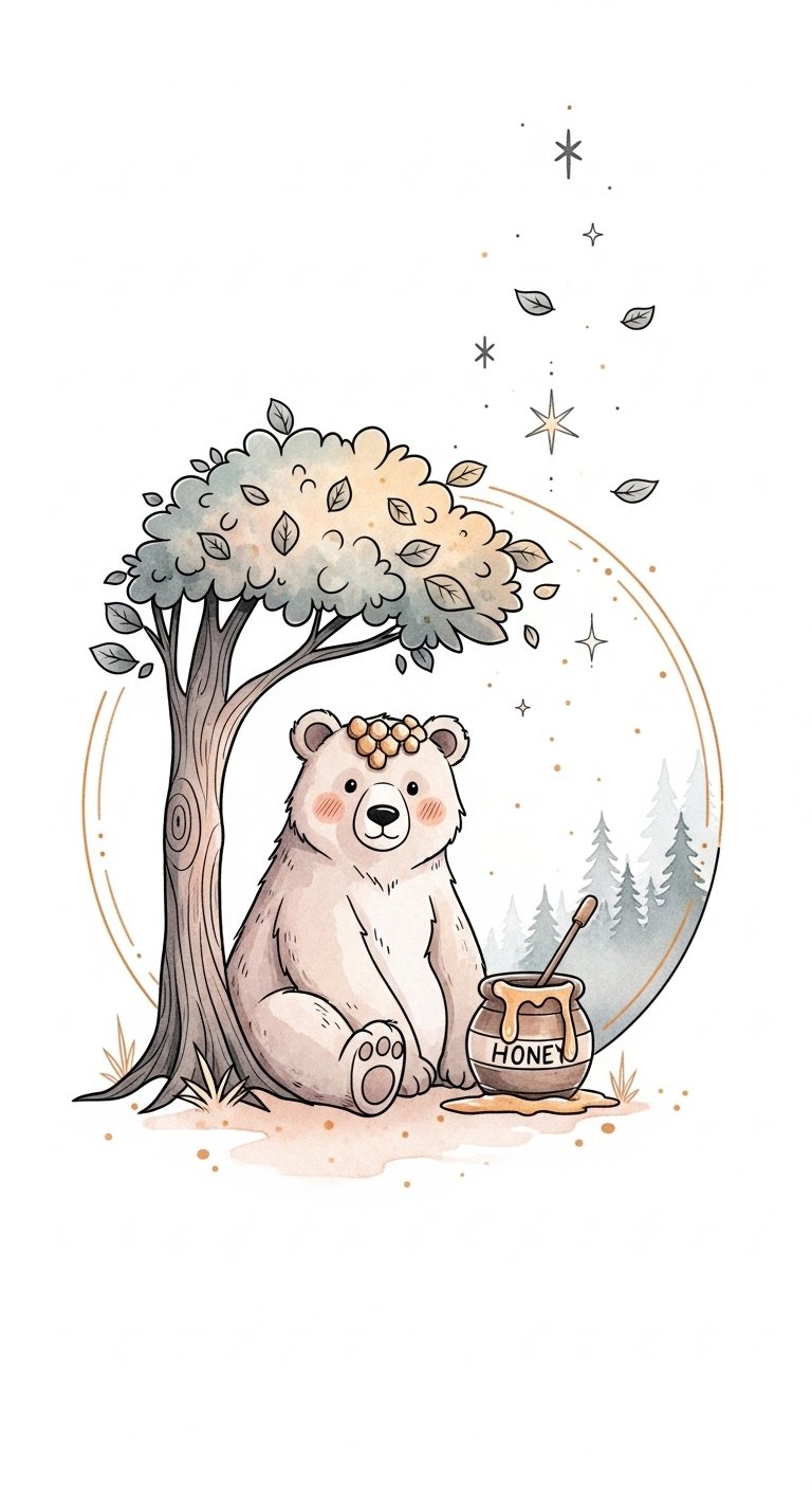 This design centers on a small scene of Pooh sitting beneath a roomy, textured oak with a scattering of wildflowers at his feet and a few bees hovering toward a nearby honey pot; soft, warm watercolor washes for the background woods, fine-line details for the flowers and bee trails, and gentle shading on Pooh keep the piece whimsical and tender.