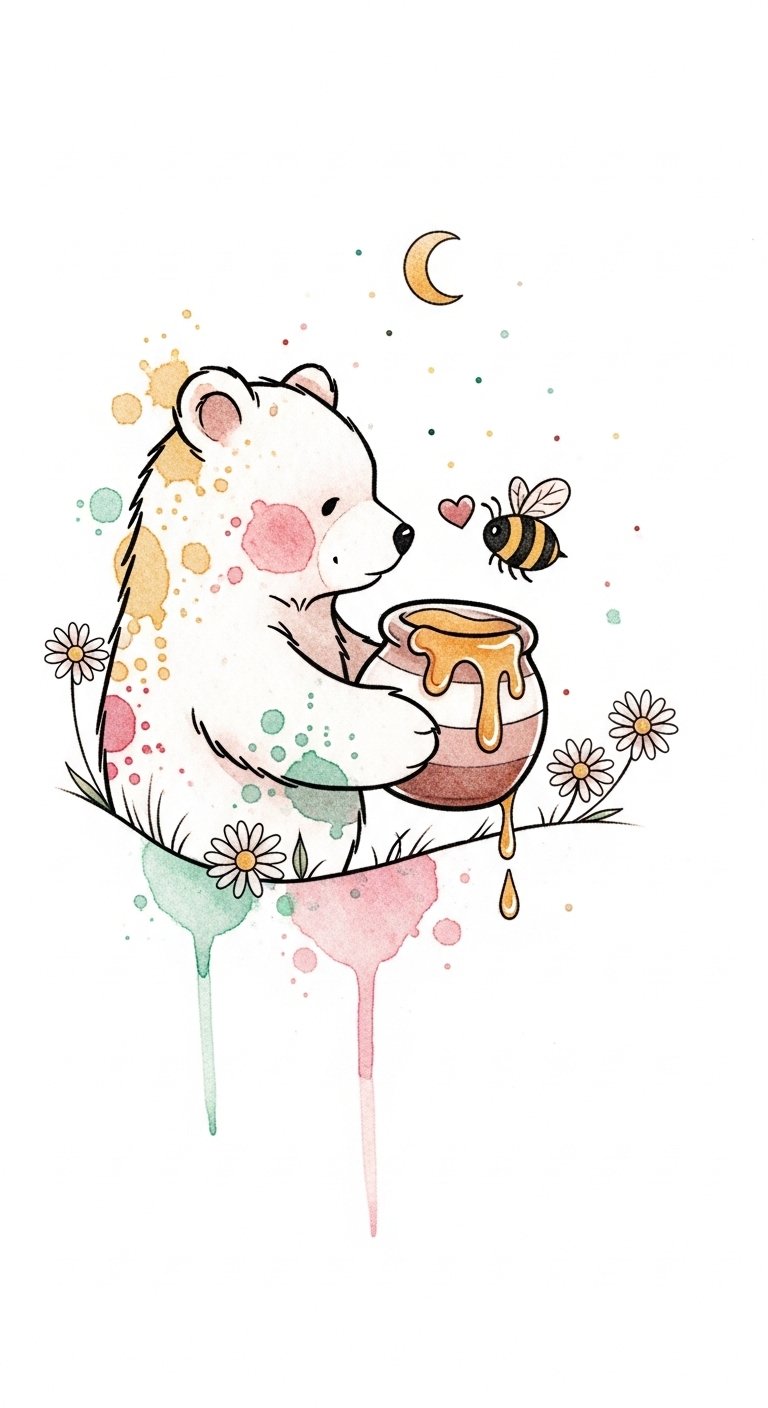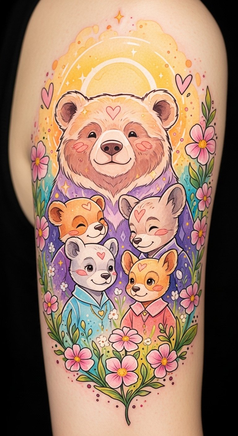 This placement—inner forearm or shoulder blade—keeps the piece intimate and easily shown to close friends; the soft watercolors and tiny honey pots symbolize warmth, shared sweetness, and gentle memories, while the floral garlands and stars evoke growth and the quiet magic of lasting companionship.
