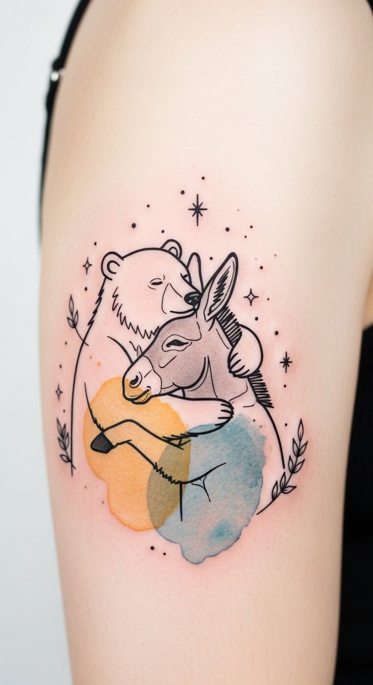 Place the trio—Pooh gently holding a honey pot, Piglet close by looking up with trust, and Eeyore slightly behind but leaning in—on the upper forearm or over the heart for intimate visibility. The symbolism centers on the warmth of companionship (Pooh), courage in vulnerability (Piglet), and quiet endurance (Eeyore), evoking comfort, loyalty, and bittersweet resilience; soft, warm colors with subtle shading and a small background of Hundred Acre Wood will emphasize emotional depth and make the piece feel like a personal, wearable story.