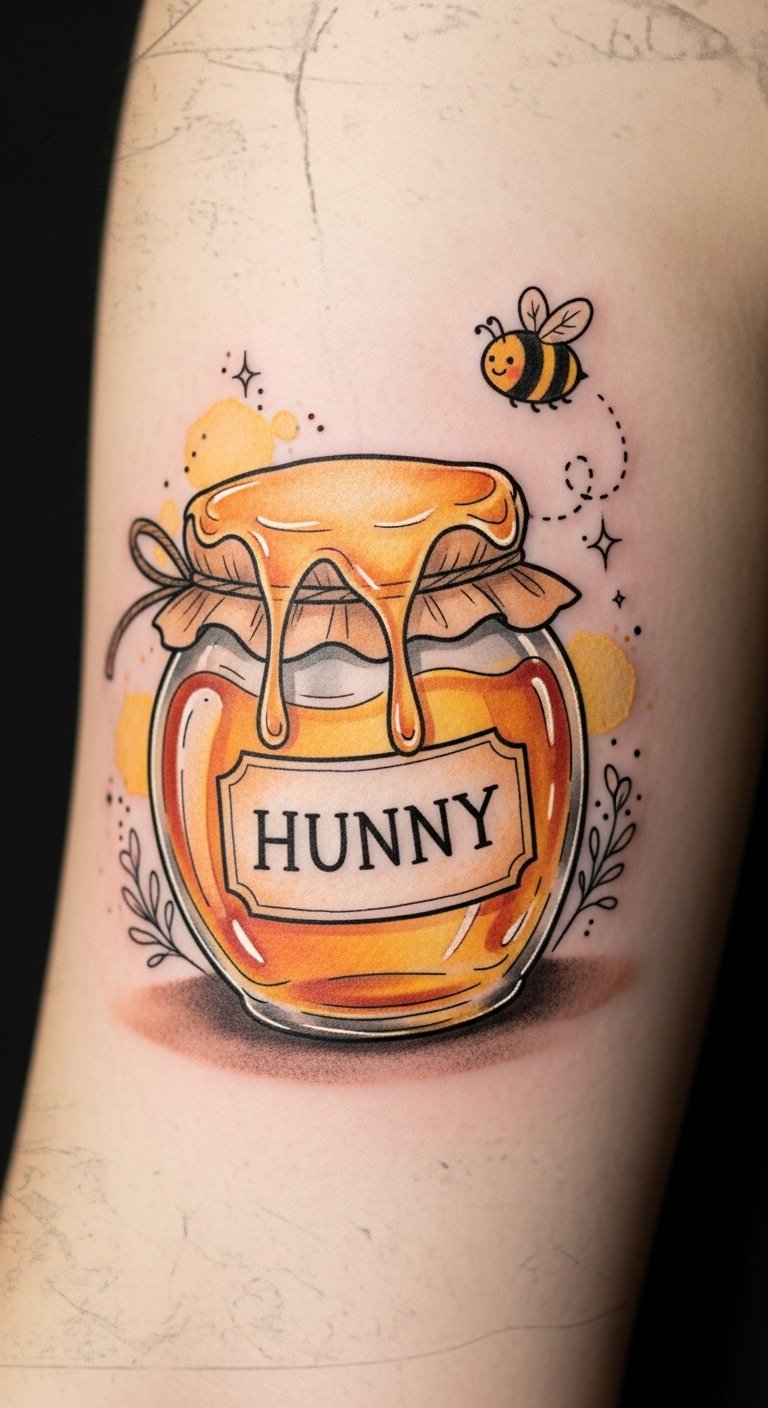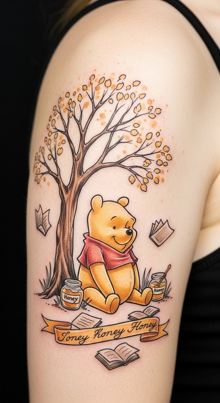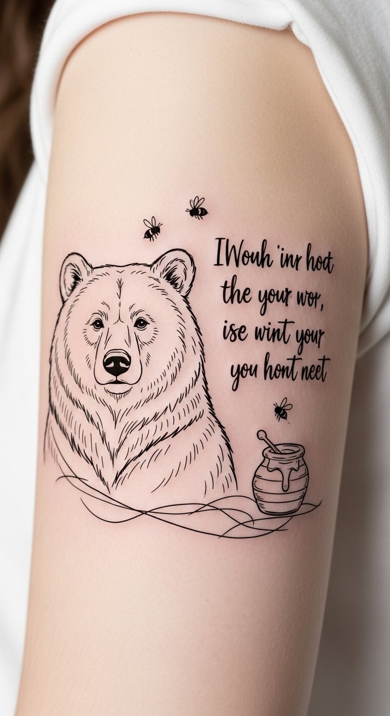 The image balances innocence (Pooh’s gentle expression and honey pot) with introspection (the handwritten quote), evoking warmth and comfort; ideal placements—inner forearm for daily visibility, ribcage for intimacy, or behind the shoulder for subtlety—allow the piece to serve as both personal talisman and shared sentiment.