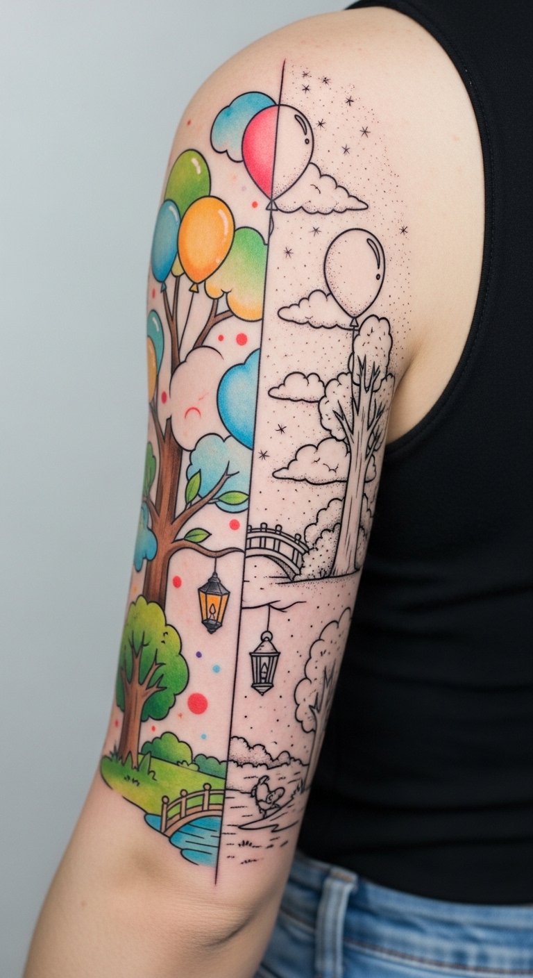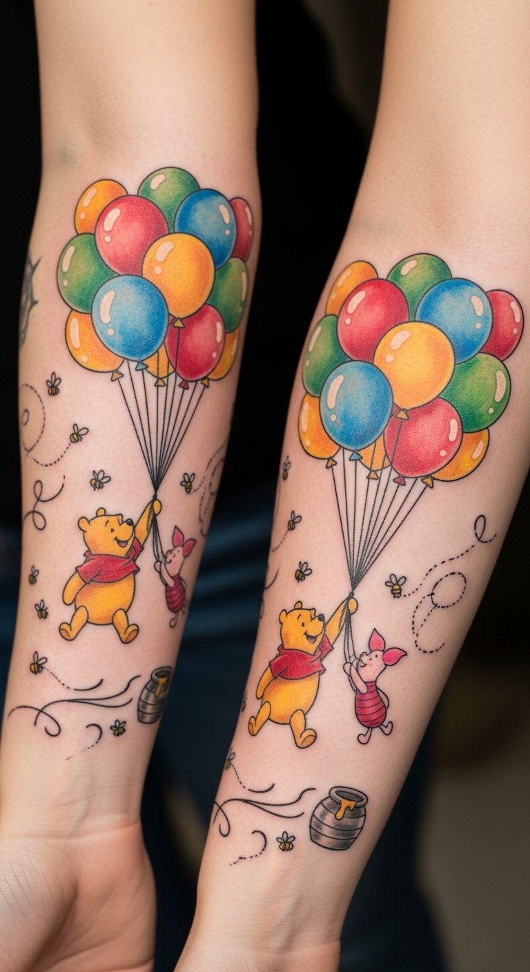 A delicate forearm or shoulder-piece showing a small, soft-edged Winnie the Pooh figure holding a cluster of bright, slightly translucent balloons that lift him gently upward; incorporate watercolor washes, subtle dotwork for texture, and a light trail of sparkles and tiny honey drops trailing from the balloons. Symbolically this design speaks to freedom, joy, and nostalgic innocence—emotionally uplifting and comforting—best placed where its upward motion can follow the natural line of the arm or shoulder so viewers feel the gentle ascent and the wearer is reminded to embrace life’s lighter moments.