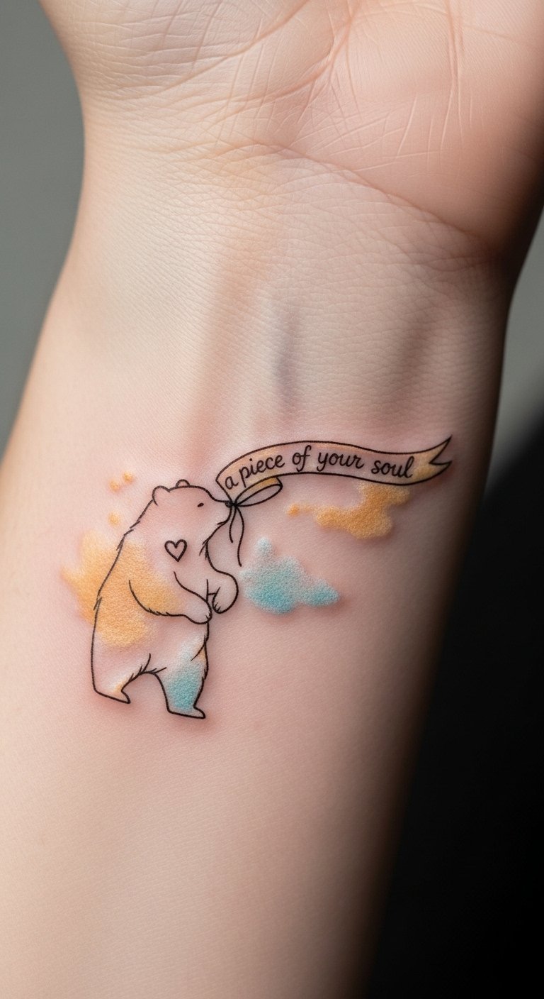 This design symbolizes nostalgia, warmth, and intimate memory—Pooh’s gentle presence paired with the phrase evokes comfort and inner truth. The wrist placement allows for frequent glances and quiet reminders; an over-the-heart variant emphasizes deep emotional connection.
