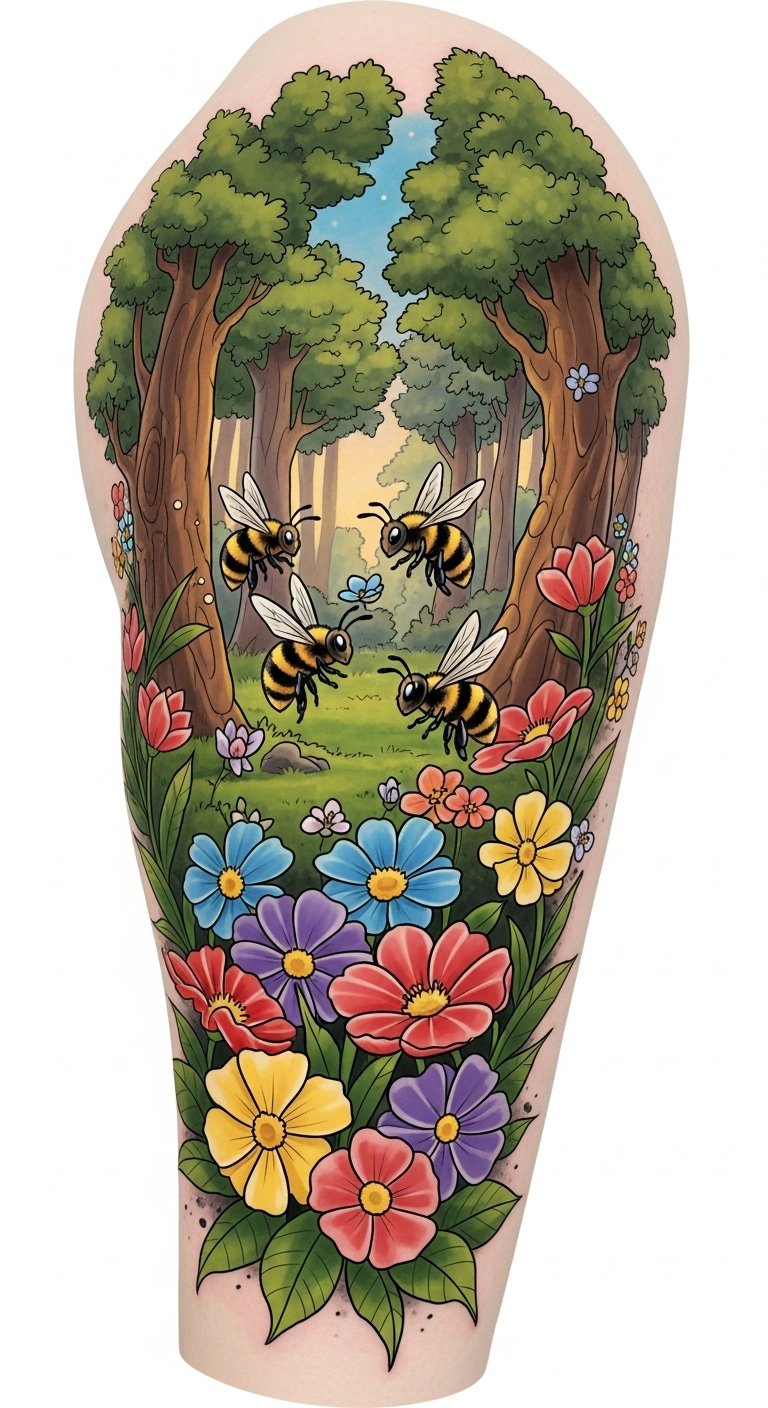 This design evokes warmth, nostalgia, and whimsy—flowers bring uplift and movement, honey adds warmth and comfort, and the bees suggest gentle companionship; ideal placement is on the outer forearm, calf, or shoulder blade where the composition can flow with the body’s contours and be easily shown or covered for personal significance.
