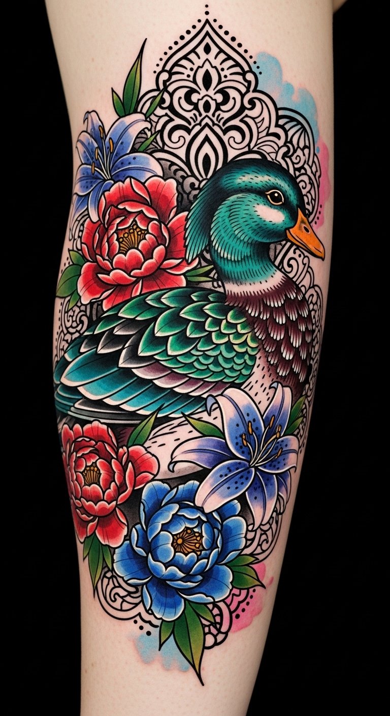 Neo-Traditional Duck Tattoo With Floral Accents