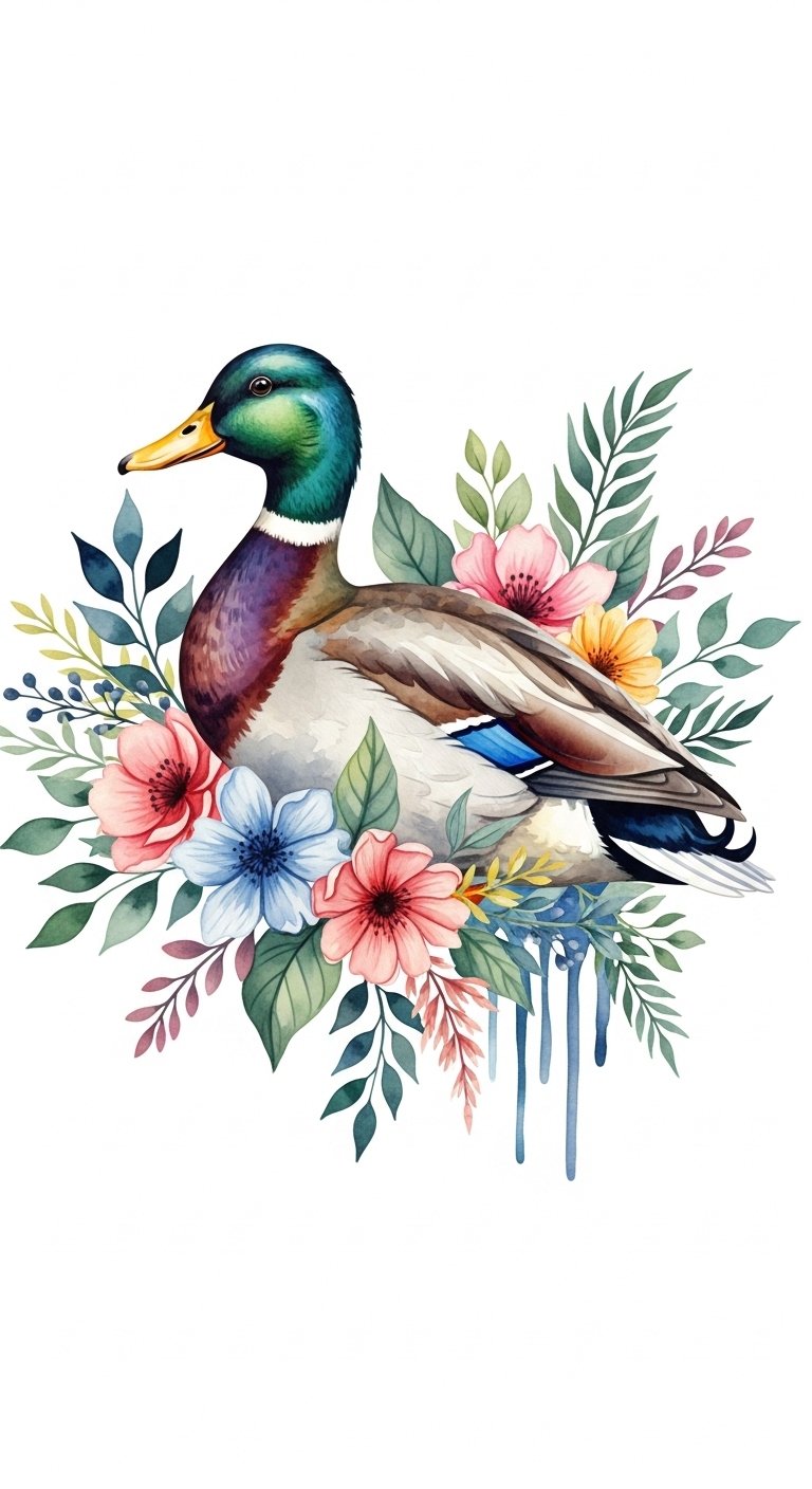 Watercolor Duck Surrounded by Nature