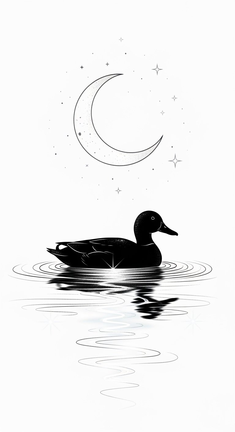 The design symbolizes peaceful introspection and the gentle guidance of lunar energy; the duck represents freedom and adaptability while the crescent moon and stars evoke dreams, mystery, and the unseen currents of the night.