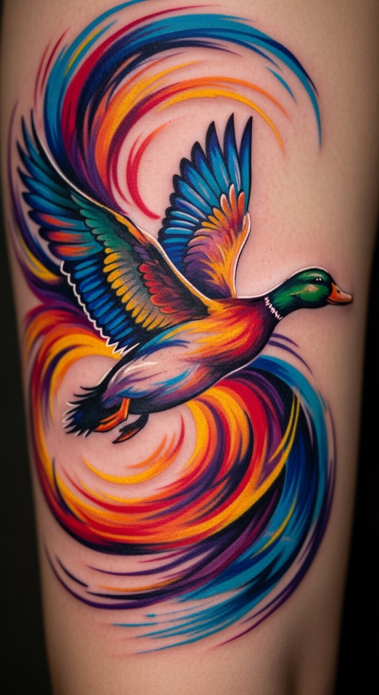 This design symbolizes liberation, self-expression, and a playful embrace of the unexpected; the abstract duck and swirling colors evoke movement, optimism, and personal evolution while the layered brushstrokes suggest resilience and the many facets of identity. Emotionally it reads as uplifting and bold, suitable for someone who values creativity and independence; ideal placements include the upper arm, shoulder blade, or ribcage where the flow of swirls can wrap and follow the body’s contours, allowing the dynamic shapes to accentuate motion and form.