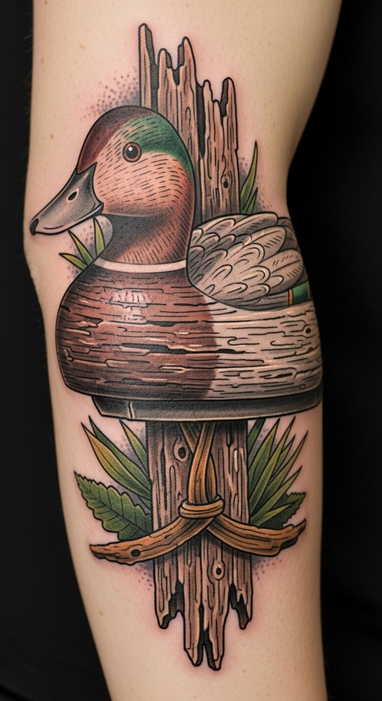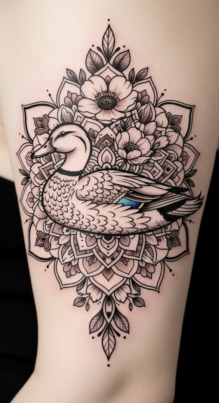 Ducks symbolize resourcefulness and emotional balance, making this tattoo not just a visual masterpiece but a meaningful tribute to the essence of life.