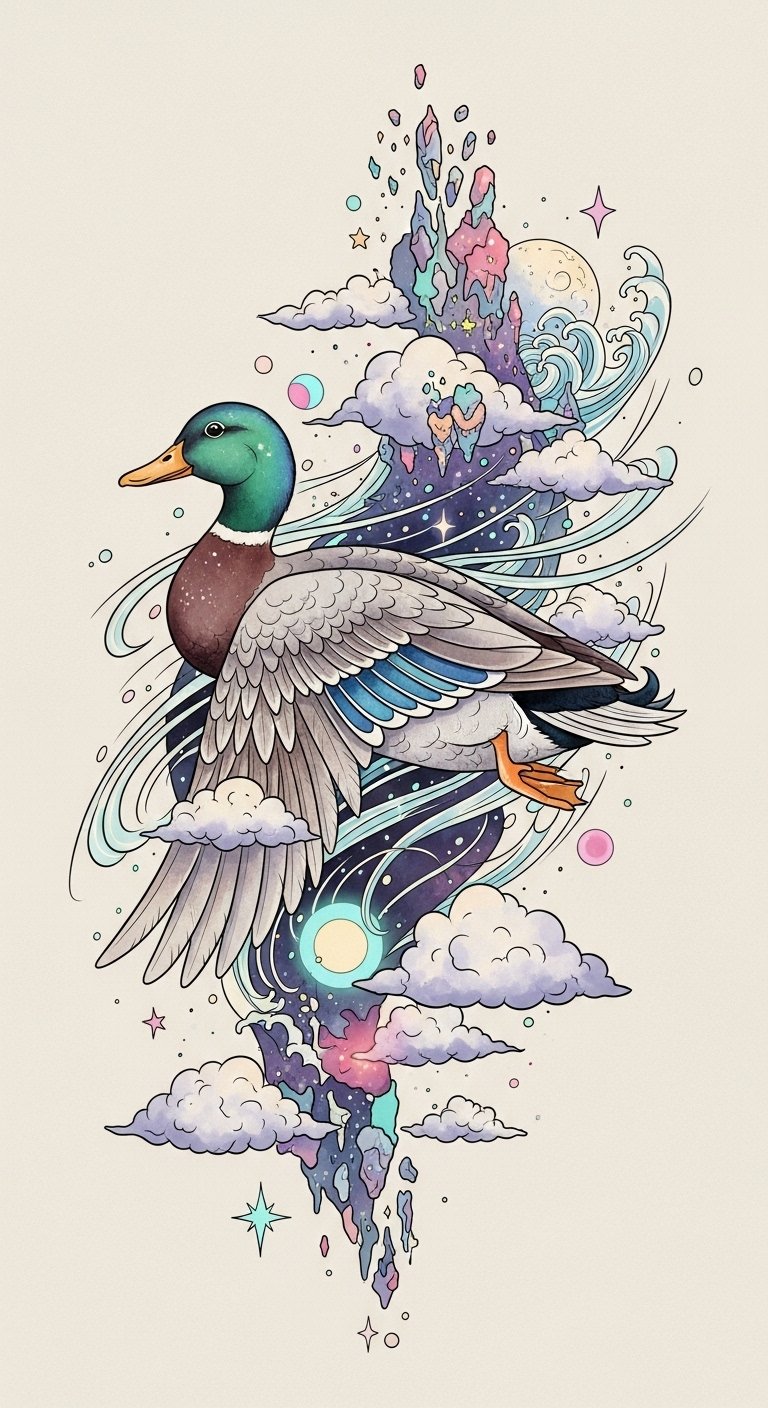 Picture a duck gliding through a surreal dreamscape, surrounded by whimsical imagery like floating clouds and vibrant colors. Each design tells a story, allowing you to express your inner freedom.