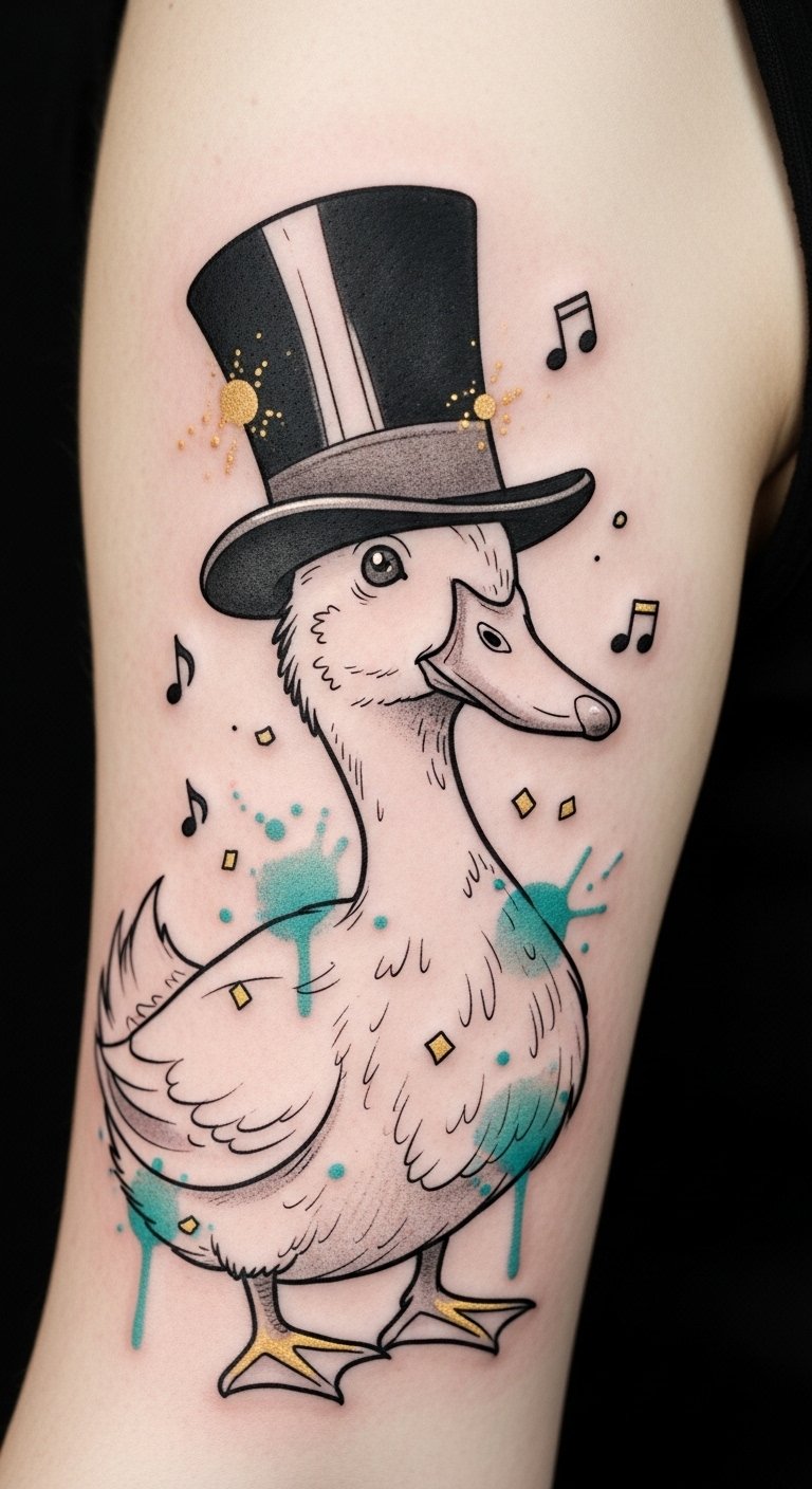 Imagine the delight of a quirky duck in a top hat, bringing a splash of whimsy to your tattoo collection.