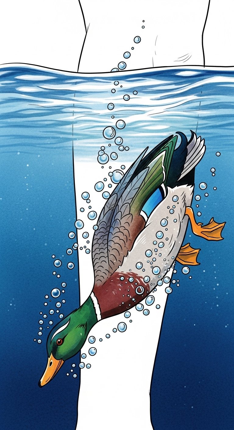 Beneath the shimmering surface, a duck gracefully dives underwater, its vibrant feathers creating a striking contrast against the deep blue. As it swims, you can see bubble patterns swirling around, each pop echoing freedom.