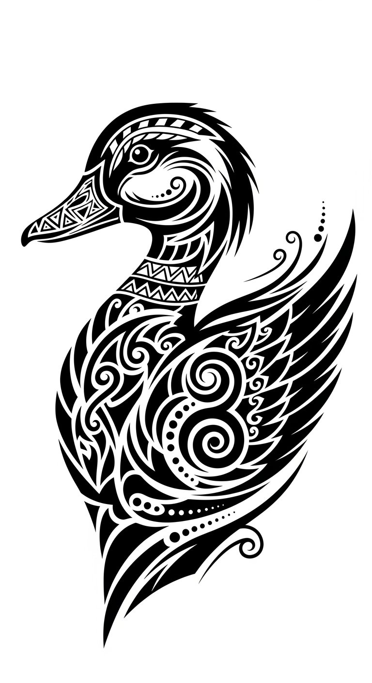 By choosing a tribal duck, you celebrate heritage while boldly expressing your unique spirit. The design symbolizes adaptability, grace, and a grounded connection to ancestral roots; it evokes calm confidence and a protective presence.