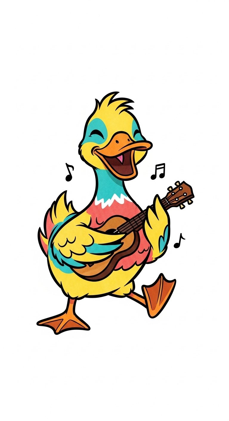A vibrant cartoon duck strumming a cheerful tune on a ukulele can instantly brighten your day.