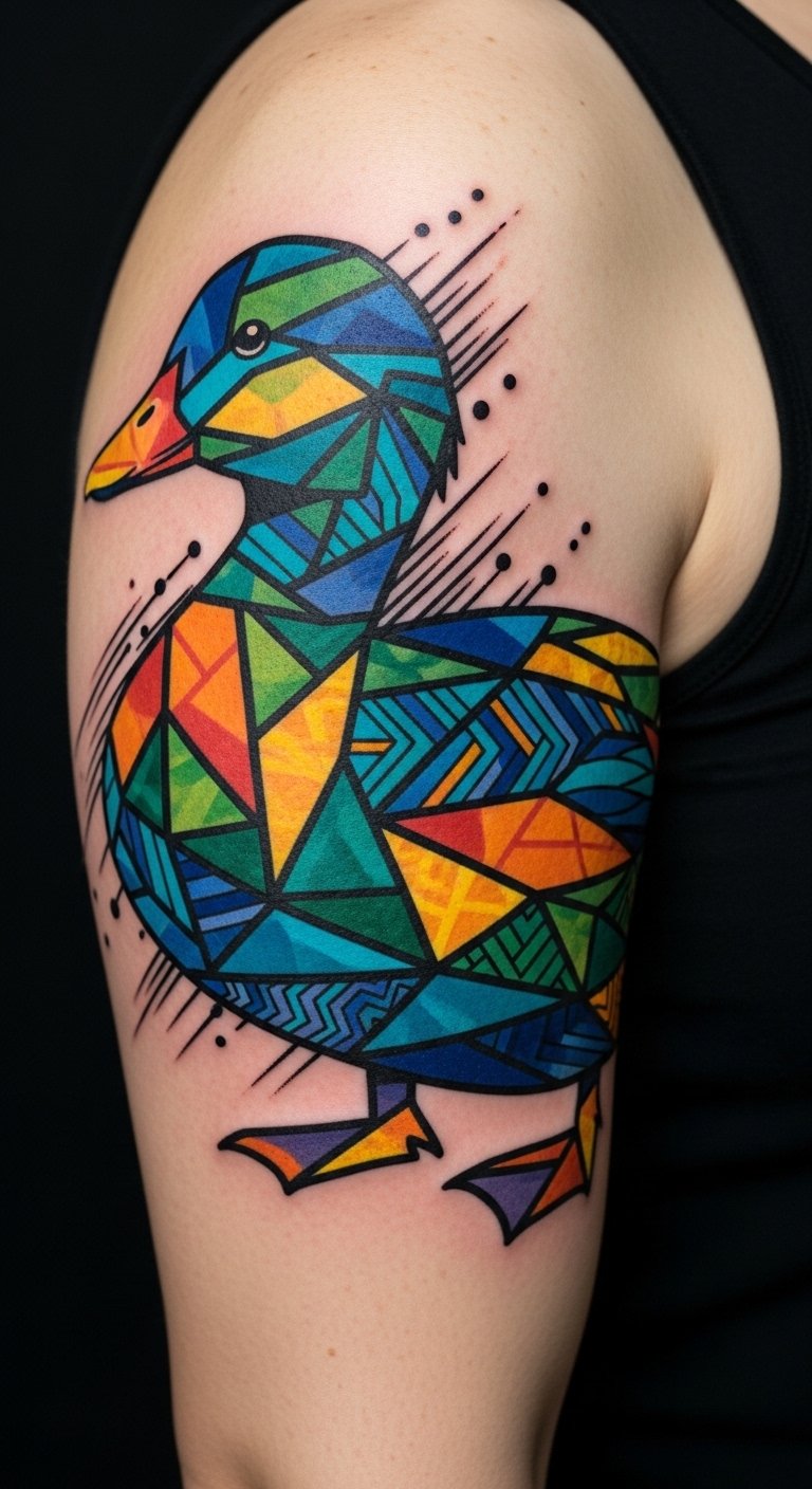 As you explore the world of tattoo art, consider the striking appeal of a stylized duck adorned with colorful geometric shapes. This design bursts with vibrant hues and intricate patterns, allowing your personality to shine.